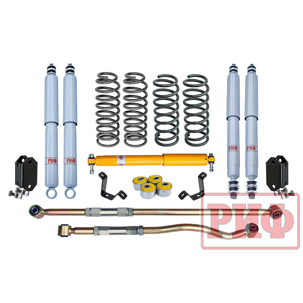 Все компоненты лифт-комплектов РИФ разработаны специально для эксплуатации внедорожника в тяжелых условиях на различных дорожных покрытиях. Рессоры, амортизаторы с технологией Foam Cell и пружины РИФ не только компенсируют вес установленного на внедорожнике дополнительного оборудования (бамперов, порогов, дополнительных топливных баков, лебедок и прочего), но также существенно повышают грузоподъемность автомобиля. Удлиненные стремянки и серьги РИФ произведены из высококачественных материалов и имеют увеличенный запас прочности. Рессорные втулки РИФ изготовлены из полиуретана обладает высокой упругостью, износостойкостью и термоустойчивостью к высоким или низким температурам.