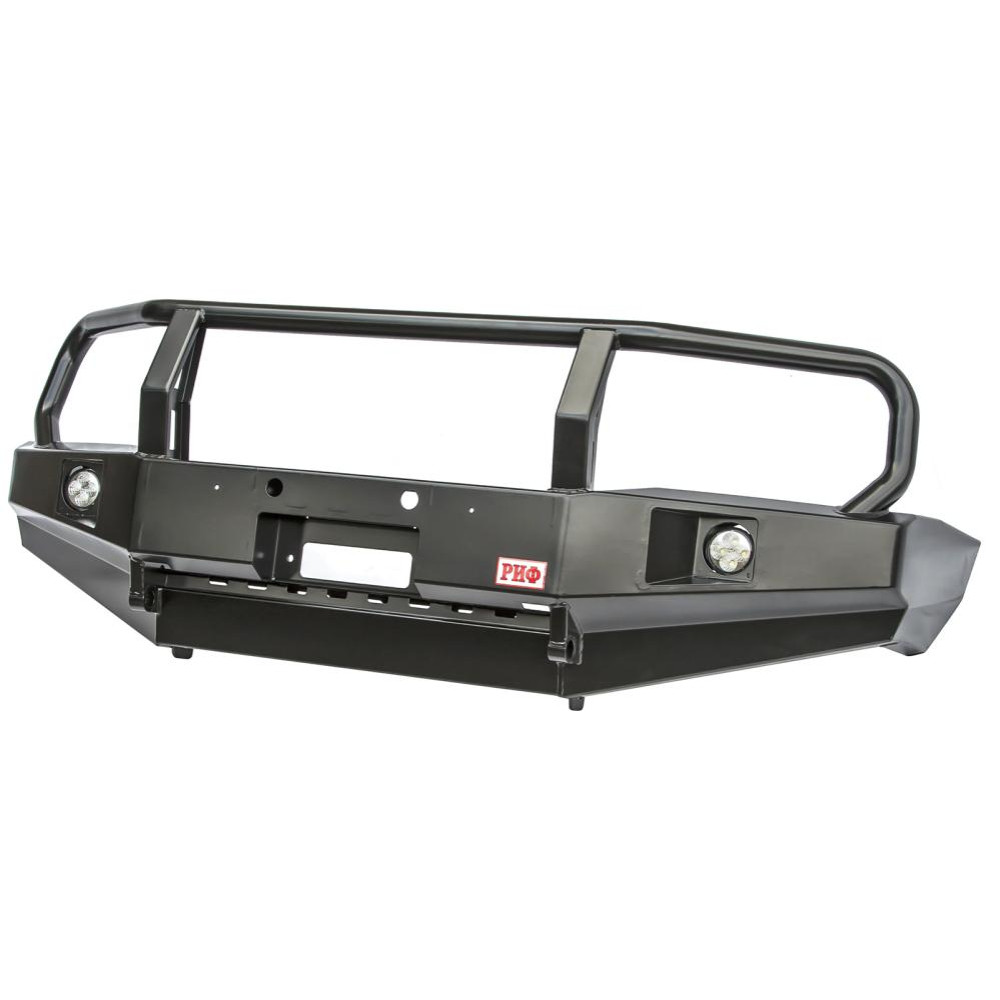 Передний силовой бампер с защитной дугой РИФ служит для защиты автомобиля на бездорожье и в городе. В случае контакта или легкого столкновения с препятствием в виде камней, бревен, пней, колей или незадачливых водителей, риск получить серьезные повреждения машины существенно уменьшается, а это очень важно в экспедициях и в повседневной жизни. Бампер с кенгурятником не только защитит, но и украсит внедорожник благодаря эффектному и элегантному дизайну.