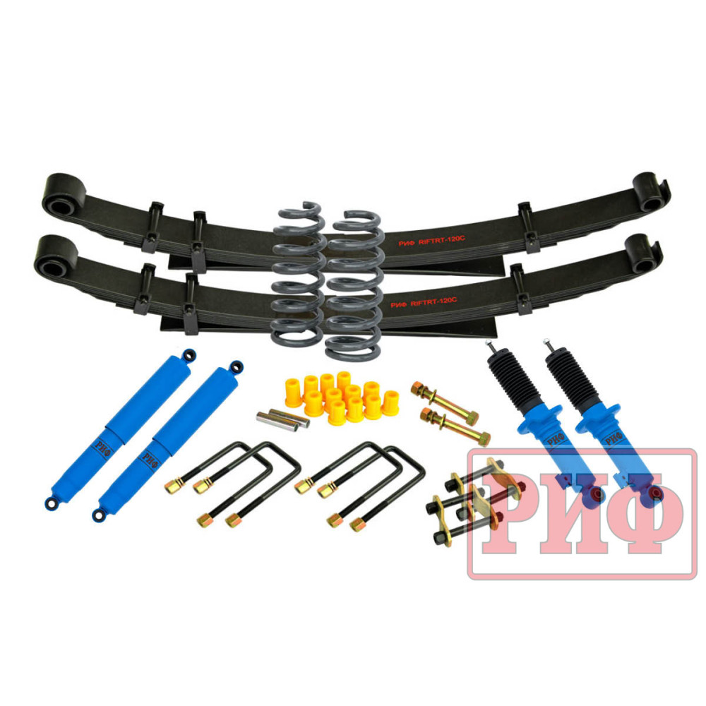 Все компоненты лифт-комплектов РИФ разработаны специально для эксплуатации внедорожника в тяжелых условиях на различных дорожных покрытиях. Амортизаторы с технологией R-AIR и пружины РИФ не только компенсируют вес установленного на внедорожнике дополнительного оборудования (бамперов, порогов, дополнительных топливных баков, лебедок и прочего), но также существенно повышают грузоподъемность автомобиля.
