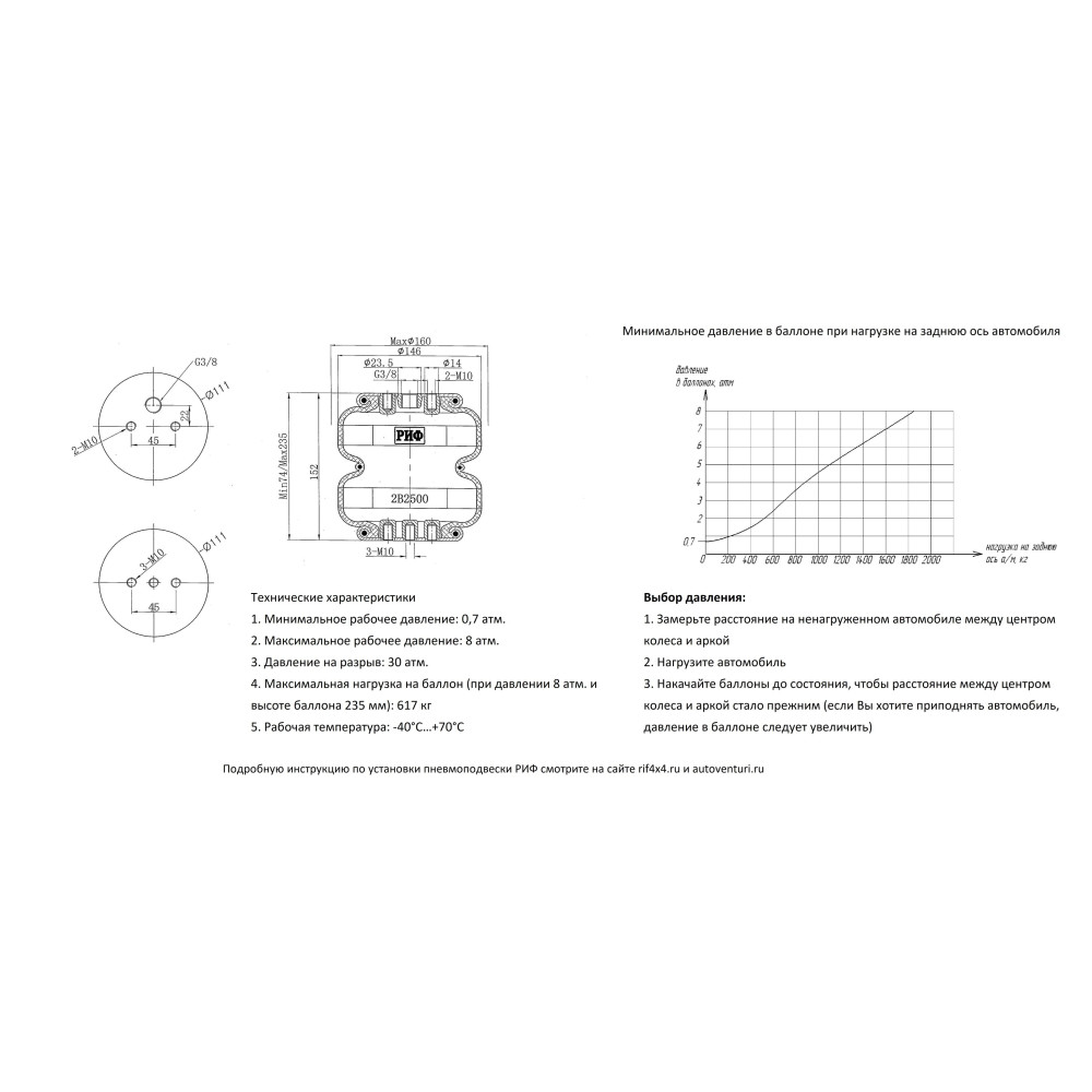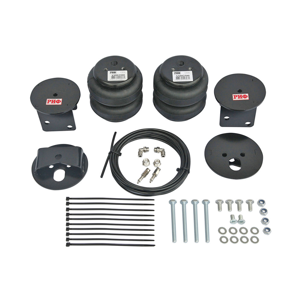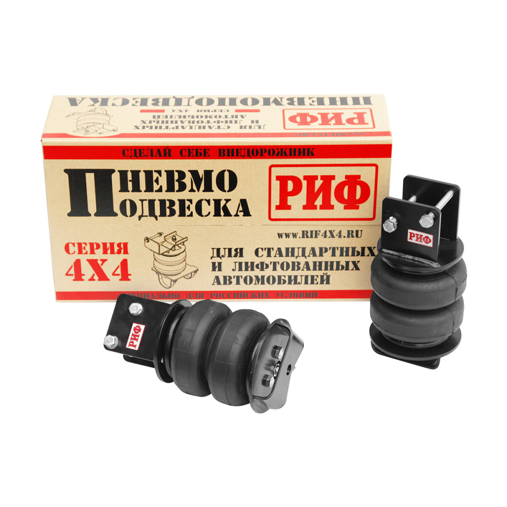 Комплект пневмоподвески РИФ устанавливается в дополнение к штатной подвеске автомобиля и позволяет снизить нагрузку на рессоры и использовать полную грузоподъёмность автомобиля без изменения геометрической проходимости.