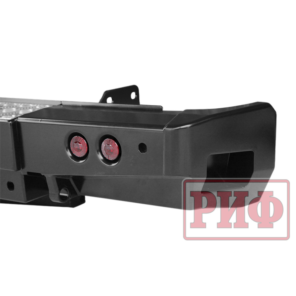 Задний силовой бампер РИФ надежно защитит кузов автомобиля на бездорожье или в городе в случае непредвиденных инцидентов. Бампер оборудован упорами под хай джек и буксирными проушинами для работы с рывковой или буксировочной стропой.
