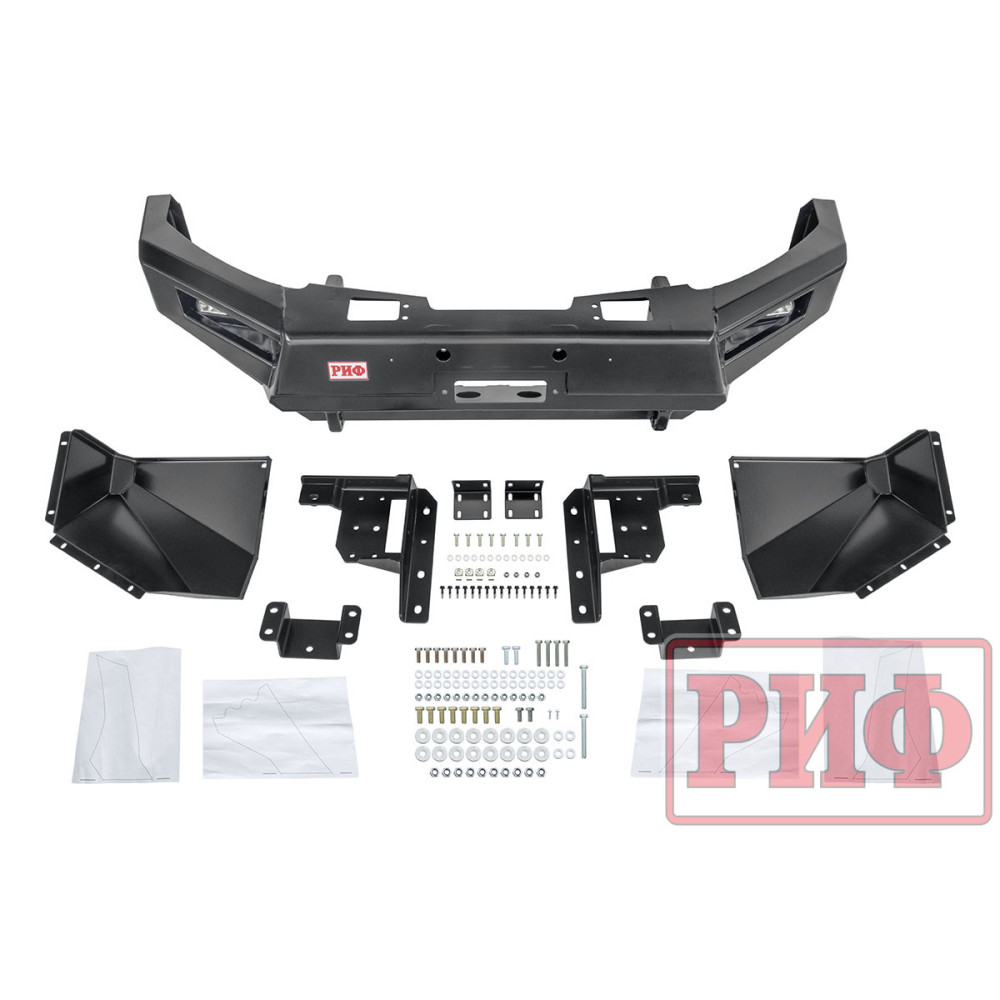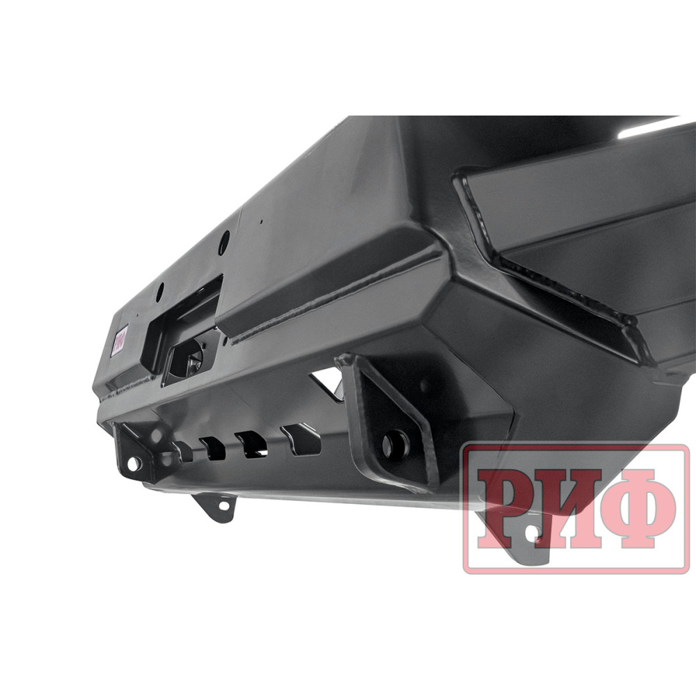 Передний силовой бампер РИФ без кенгурина служит для защиты автомобиля на бездорожье и в городе. В случае контакта или легкого столкновения с препятствием в виде камней, бревен, пней, колей или незадачливых водителей, риск получить серьезные повреждения машины существенно уменьшается, а это очень важно в экспедициях и в повседневной жизни. Бампер без кенгурина весит меньше, чем бампер с кенгурином, он не только защитит, но и украсит внедорожник благодаря эффектному и элегантному дизайну.