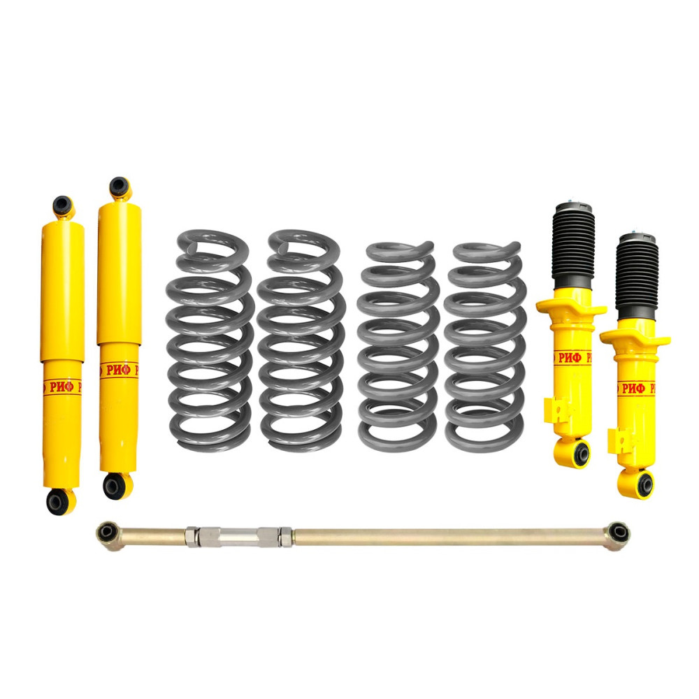 Все компоненты лифт-комплектов РИФ разработаны специально для эксплуатации внедорожника в тяжелых условиях на различных дорожных покрытиях. Амортизаторы с технологией R-Air и пружины РИФ не только компенсируют вес установленного на внедорожнике дополнительного оборудования (бамперов, порогов, дополнительных топливных баков, лебедок и прочего), но также существенно повышают грузоподъемность автомобиля.