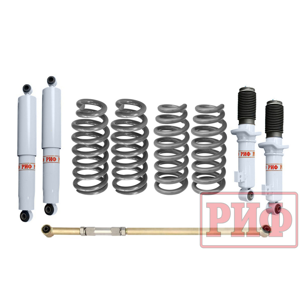 Все компоненты лифт-комплектов РИФ разработаны специально для эксплуатации внедорожника в тяжелых условиях на различных дорожных покрытиях. Амортизаторы с технологией R-Air и пружины РИФ не только компенсируют вес установленного на внедорожнике дополнительного оборудования (бамперов, порогов, дополнительных топливных баков, лебедок и прочего), но также существенно повышают грузоподъемность автомобиля.