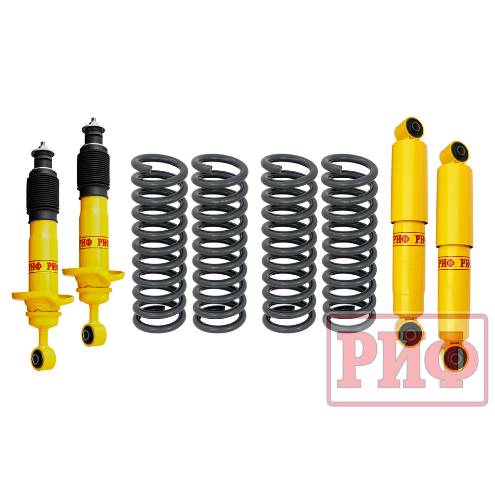 Все компоненты лифт-комплектов РИФ разработаны специально для эксплуатации внедорожника в тяжелых условиях на различных дорожных покрытиях. Амортизаторы с технологией R-Air и пружины РИФ не только компенсируют вес установленного на внедорожнике дополнительного оборудования (бамперов, порогов, дополнительных топливных баков, лебедок и прочего), но также существенно повышают грузоподъемность автомобиля.