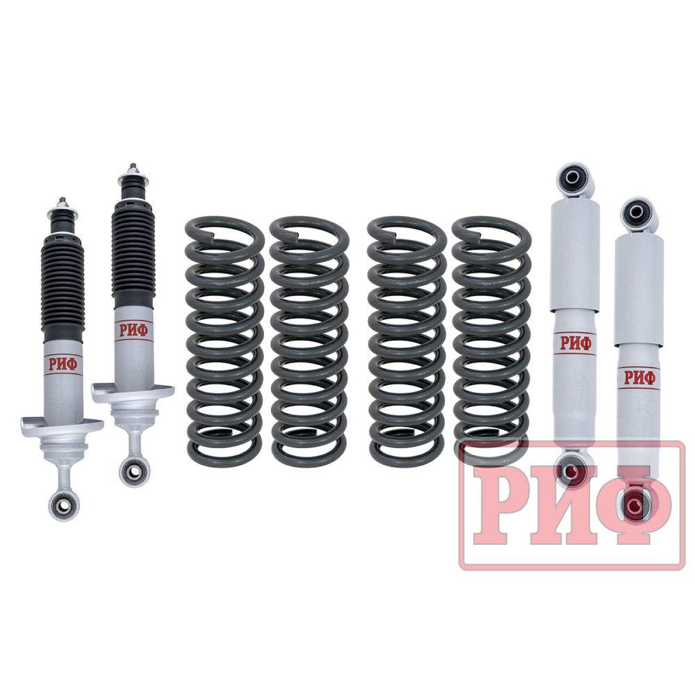Все компоненты лифт-комплектов РИФ разработаны специально для эксплуатации внедорожника в тяжелых условиях на различных дорожных покрытиях. Амортизаторы с технологией R-Air и пружины РИФ не только компенсируют вес установленного на внедорожнике дополнительного оборудования (бамперов, порогов, дополнительных топливных баков, лебедок и прочего), но также существенно повышают грузоподъемность автомобиля.