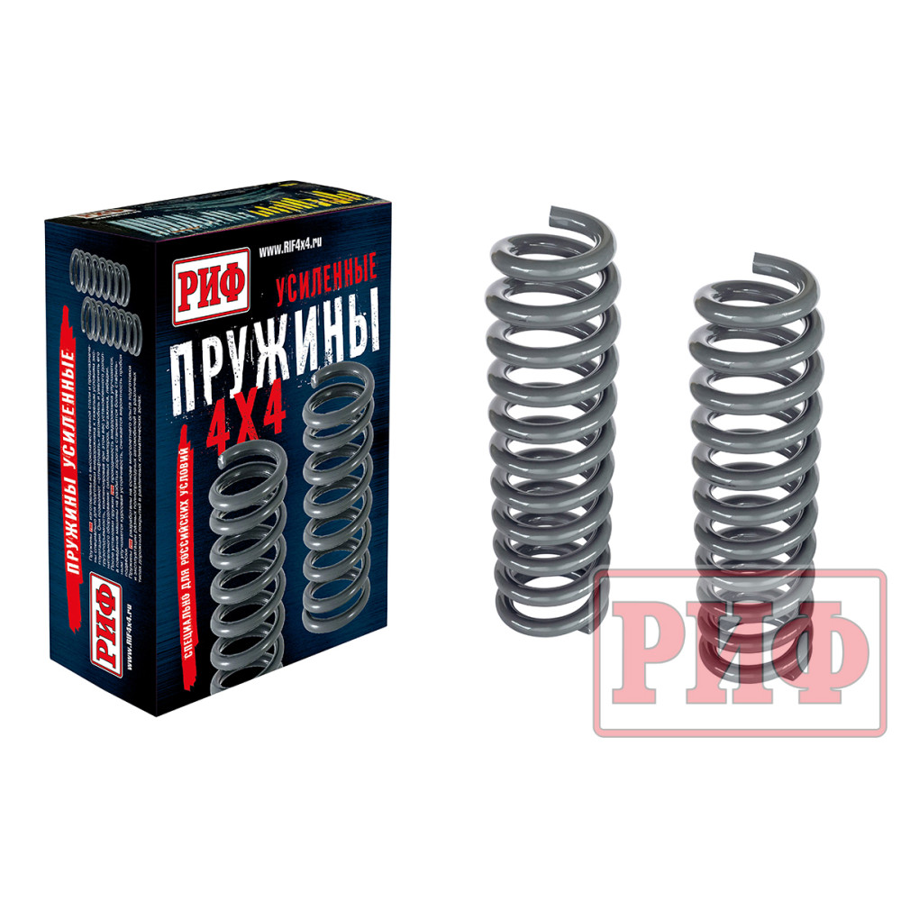 Пружины РИФ изготовлены из высококачественной стали и предназначены специально для подготовки внедорожника к тяжелым условиям эксплуатации. Они позволяют «отлифтовать» внедорожник и увеличить его грузоподъемность, компенсировав при этом вес установленного дополнительного оборудования – силовых бамперов, багажника, лебедки.