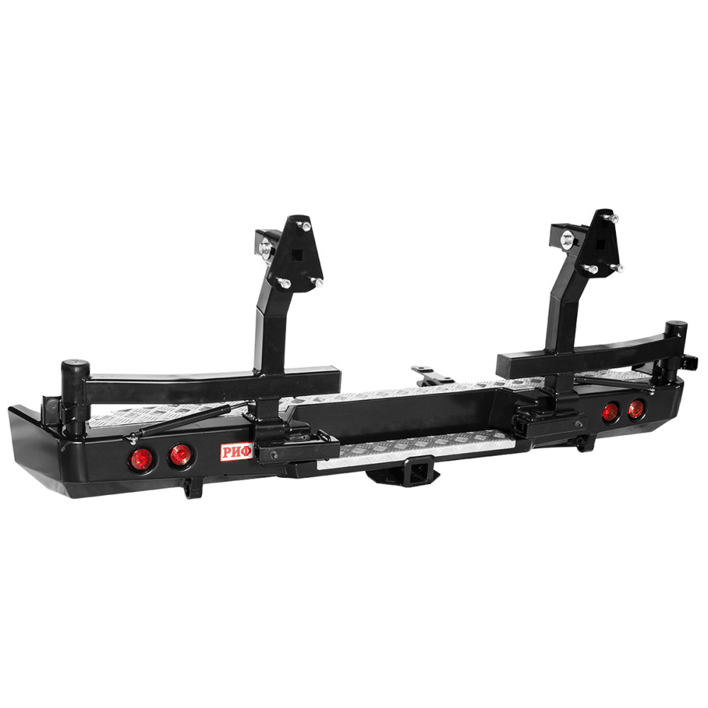 Задний силовой бампер РИФ надежно защитит кузов автомобиля на бездорожье или в городе в случае непредвиденных инцидентов. Бампер оборудован упорами под хай джек и буксирными проушинами для работы с рывковой или буксировочной стропой.