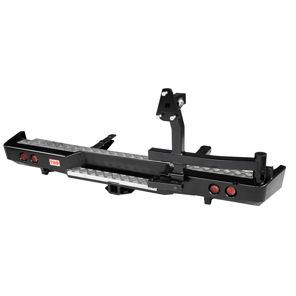 Задний силовой бампер РИФ надежно защитит кузов автомобиля на бездорожье или в городе в случае непредвиденных инцидентов. Бампер оборудован упорами под хай джек и буксирными проушинами для работы с рывковой или буксировочной стропой.