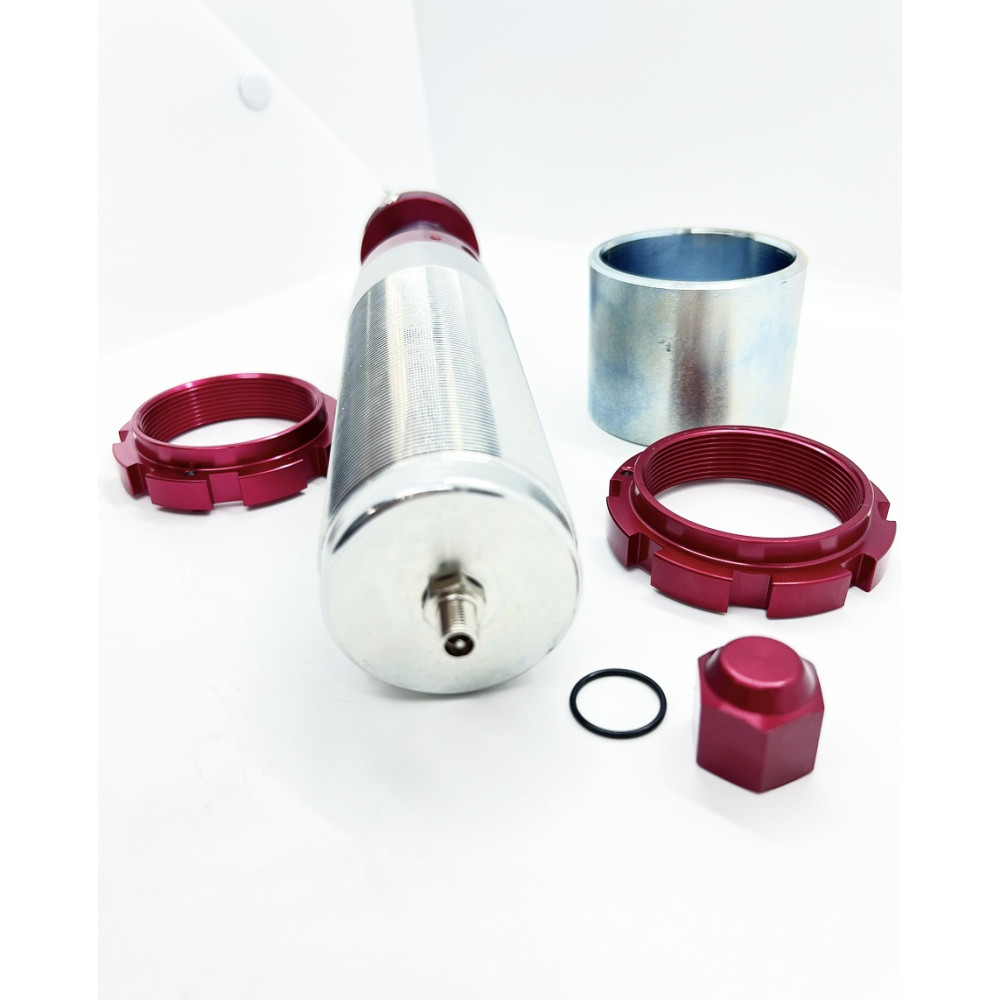 Регулировка производится с помощью насоса высокого давления через ниппель . Газ(азот) отделён от масла в теле отбойника специальным поршнем. Таким образом газ не смешивается с маслом и масло не пенится, как в обычных газомасляных амортизаторах. Это гарантирует надежную работу подвески при любых условиях. Подходит для эксплуатации в тяжелых условиях бездорожья и на скоростных участках спортивной трассы. Бесполезен в условиях городского цикла.