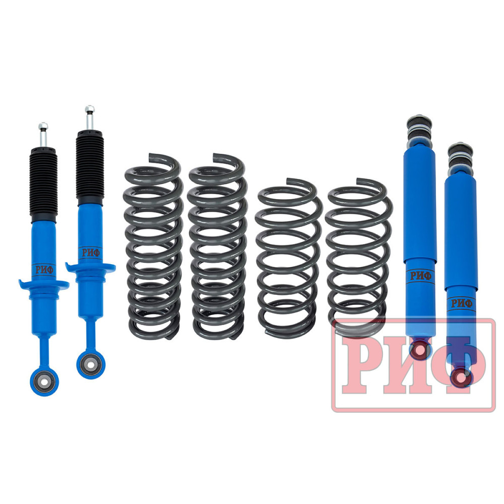 Все компоненты лифт-комплектов РИФ разработаны специально для эксплуатации внедорожника в тяжелых условиях на различных дорожных покрытиях. Амортизаторы с технологией R-AIR и пружины РИФ не только компенсируют вес установленного на внедорожнике дополнительного оборудования (бамперов, порогов, дополнительных топливных баков, лебедок и прочего), но также существенно повышают грузоподъемность автомобиля.