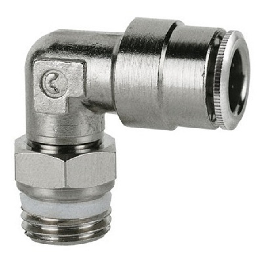 Фитинг цанговый угловой Camozzi, поворотный. Наружная резьба G1/8 с уплотнительным фторопластовым кольцом PTFE, цанга под трубку с наружным диаметром 6 мм.