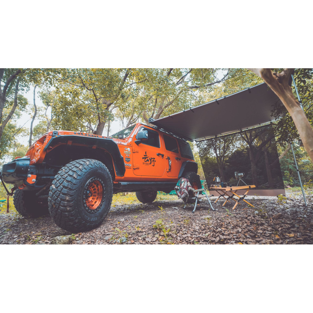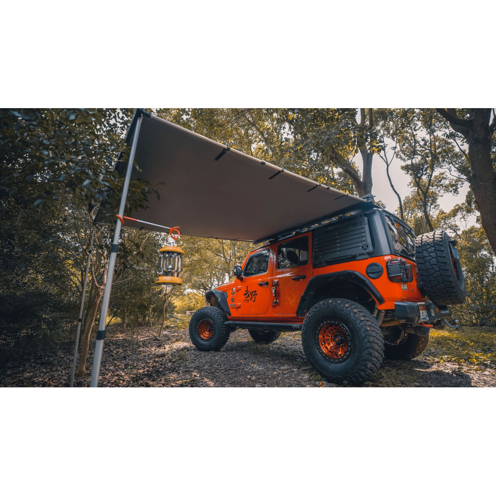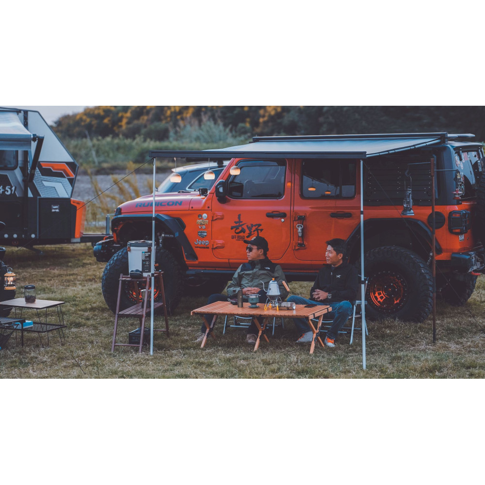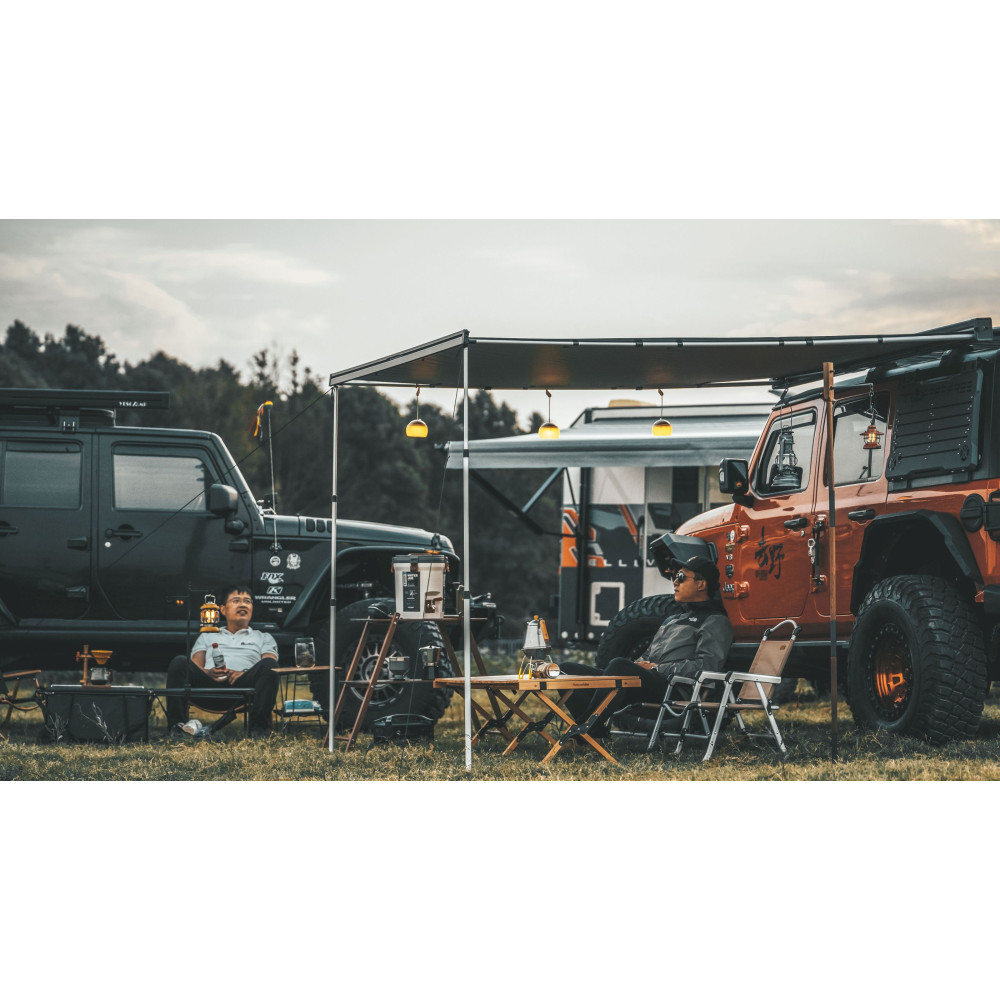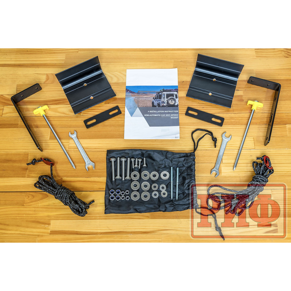 Размер тента в рабочем состоянии: 2,5 метра по длинной стороне (вдоль автомобиля) и 2,5 метра по вылету. Такой тент позволяет с комфортом разместить рядом с автомобилем трех-четырех человек.