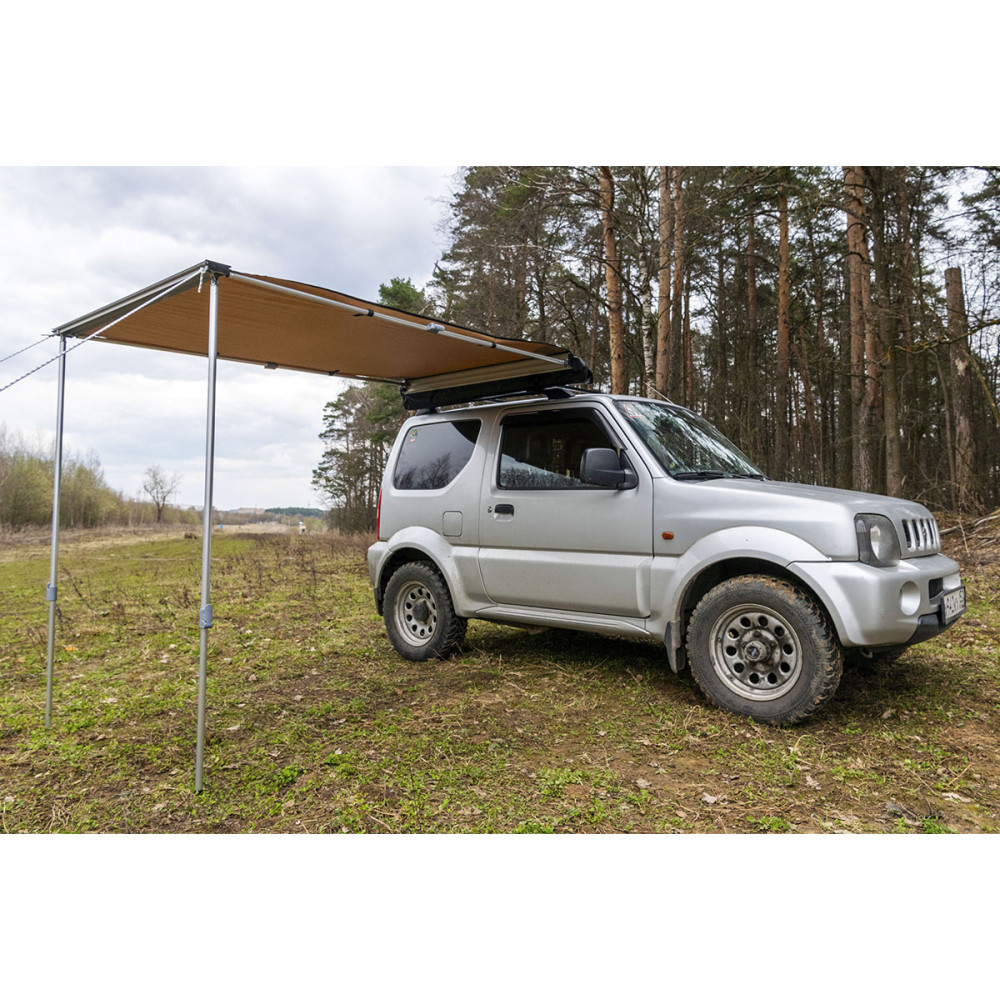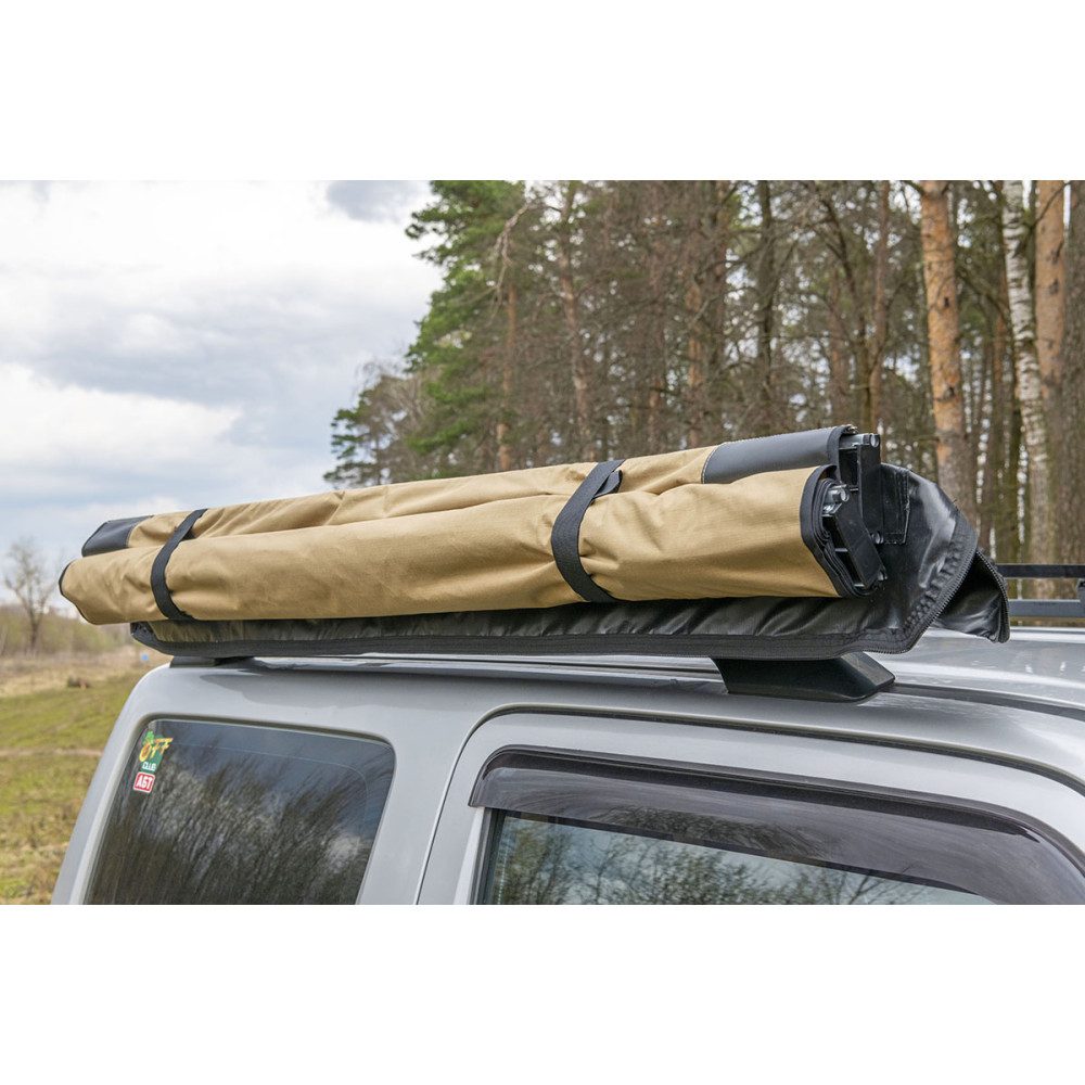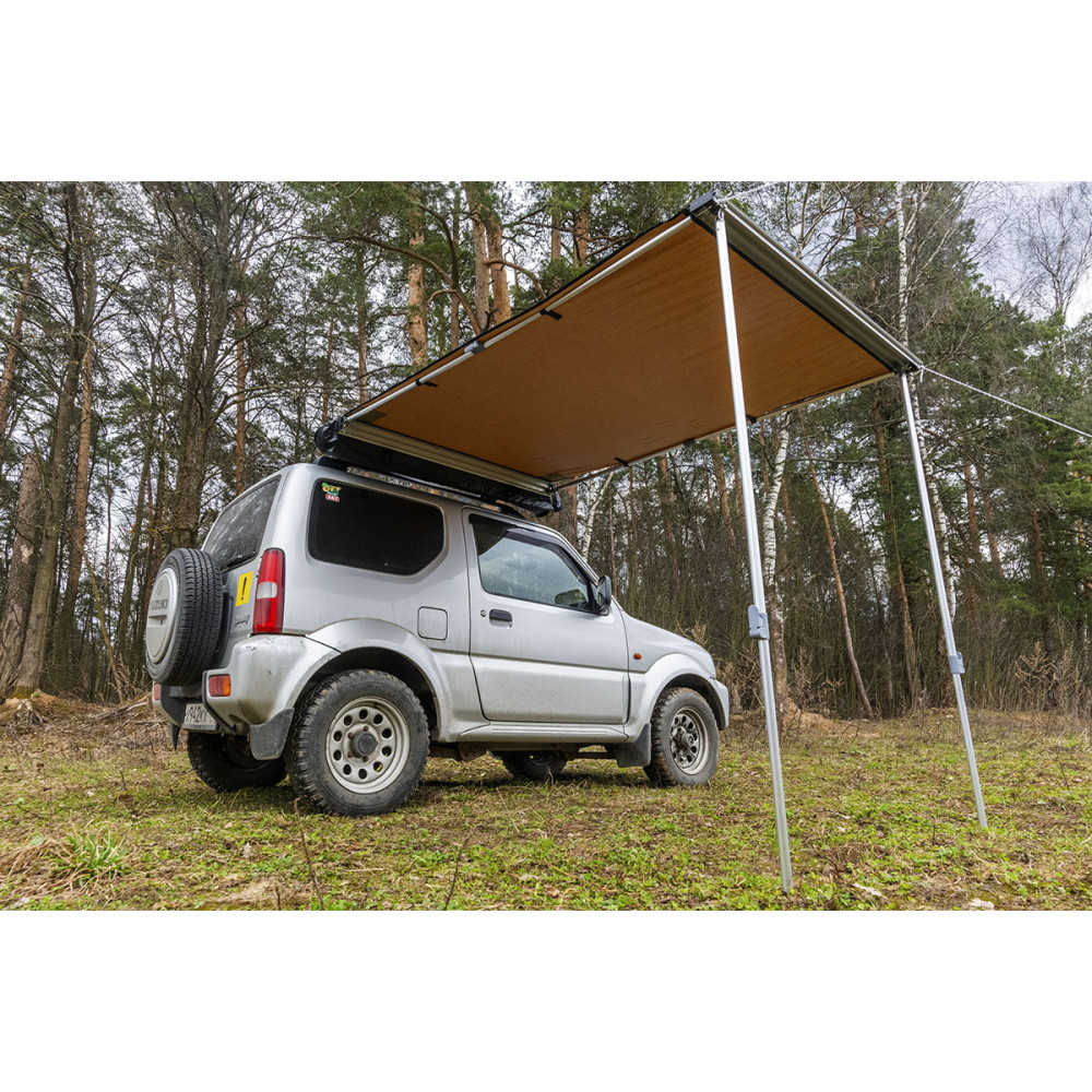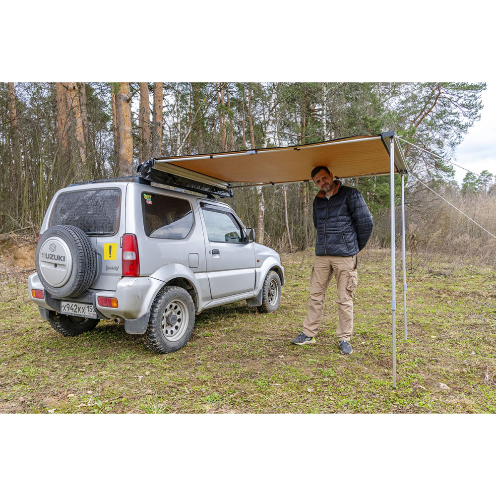 Размер тента в рабочем состоянии: 1,4 метра по автомобилю и 2 метра по вылету. Такой тент позволяет с комфортом разместить рядом с автомобилем двух человек.