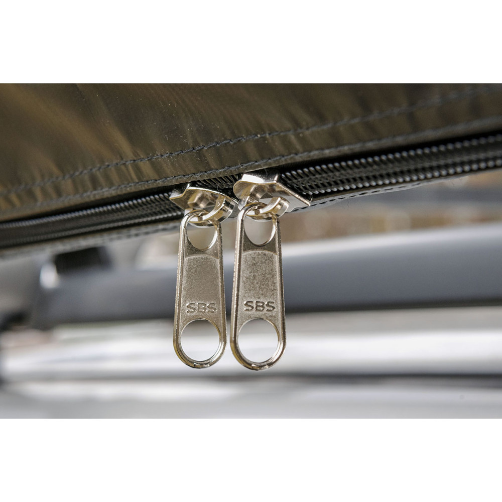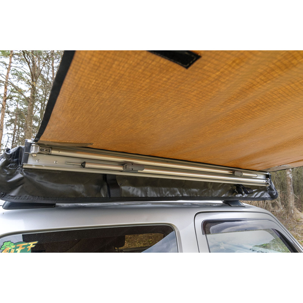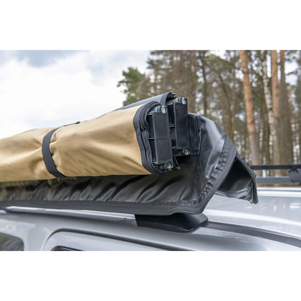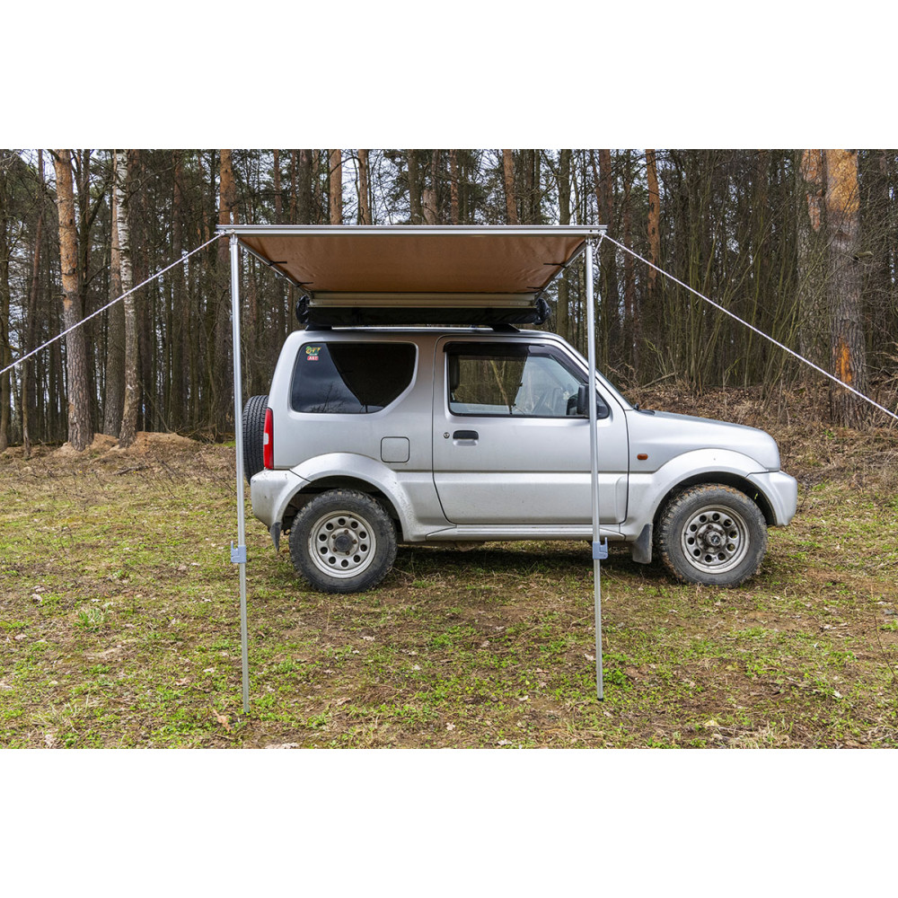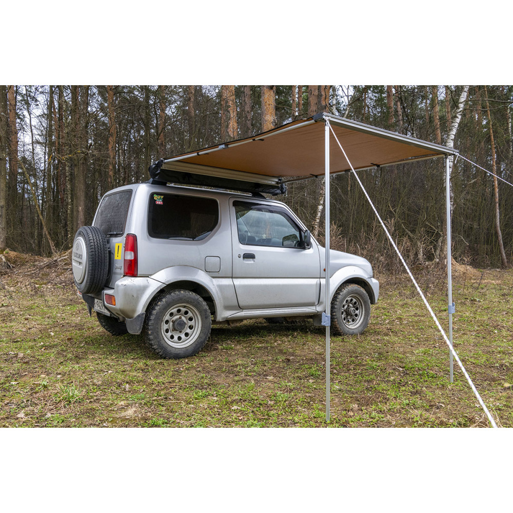 Размер тента в рабочем состоянии: 1,4 метра по автомобилю и 2 метра по вылету. Такой тент позволяет с комфортом разместить рядом с автомобилем двух человек.