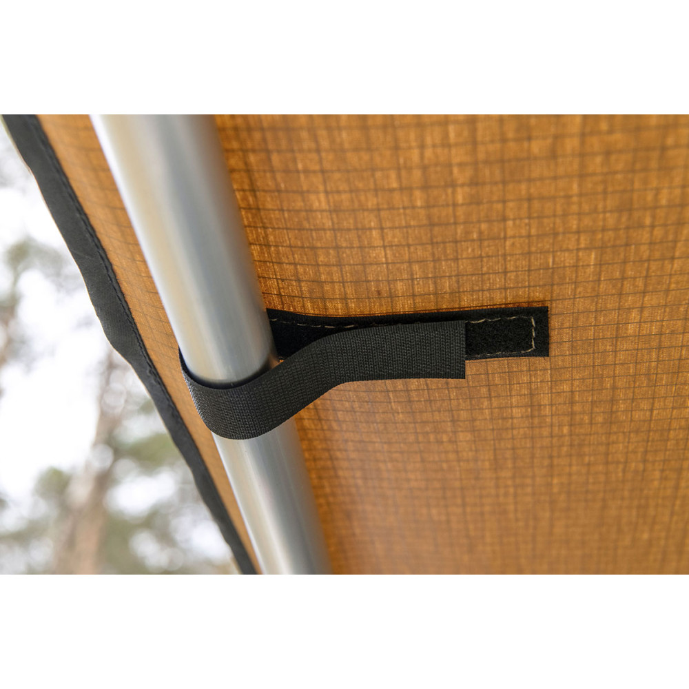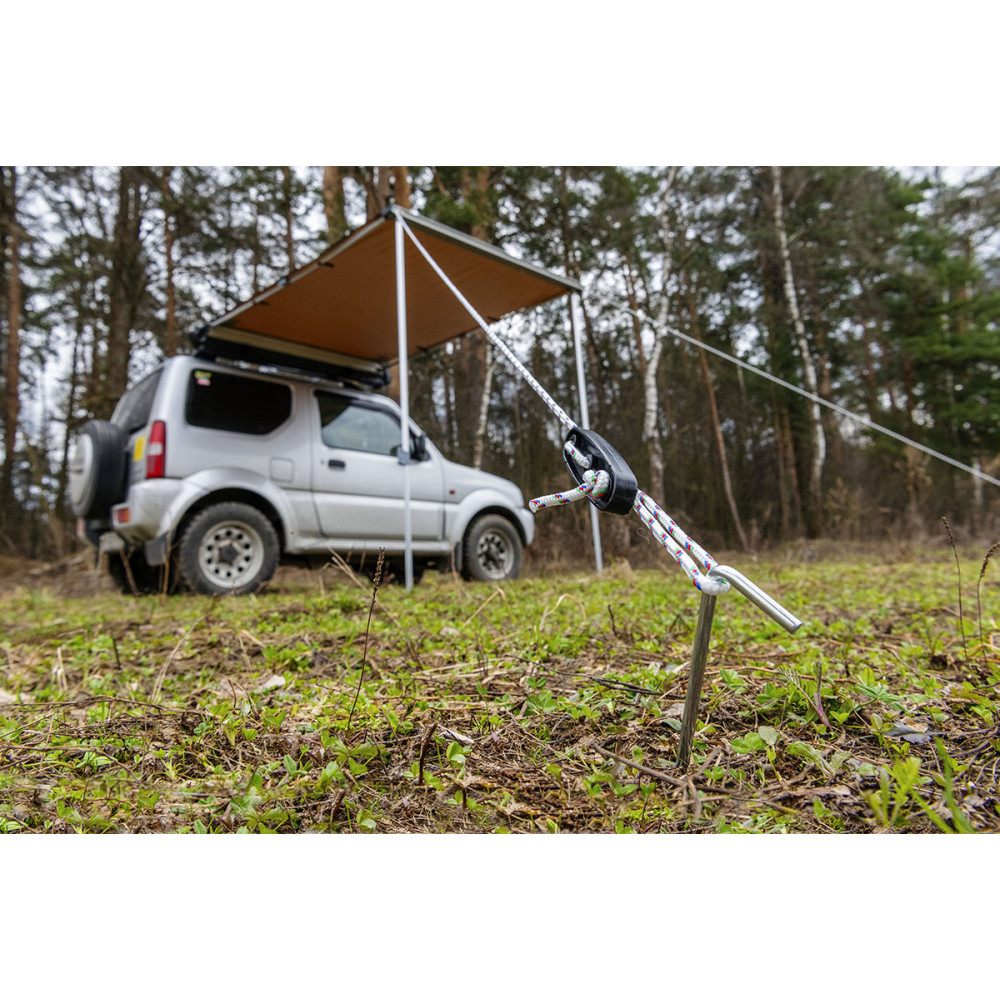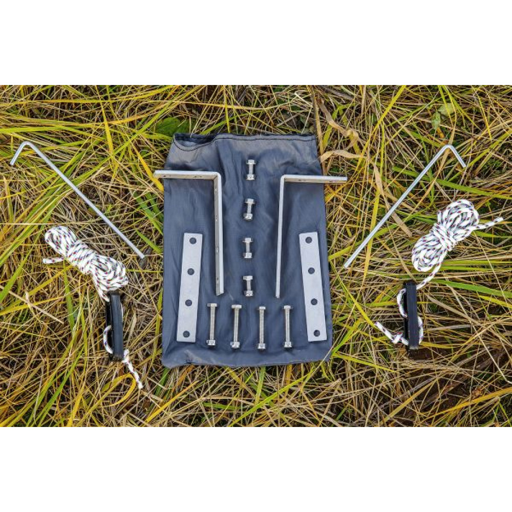 Установка тента под силу даже одному человеку и занимает не более двух-трех минут. В комплект входят веревочные растяжки с возможностью регулировки натяжения и металлические колья для крепления к грунту.
