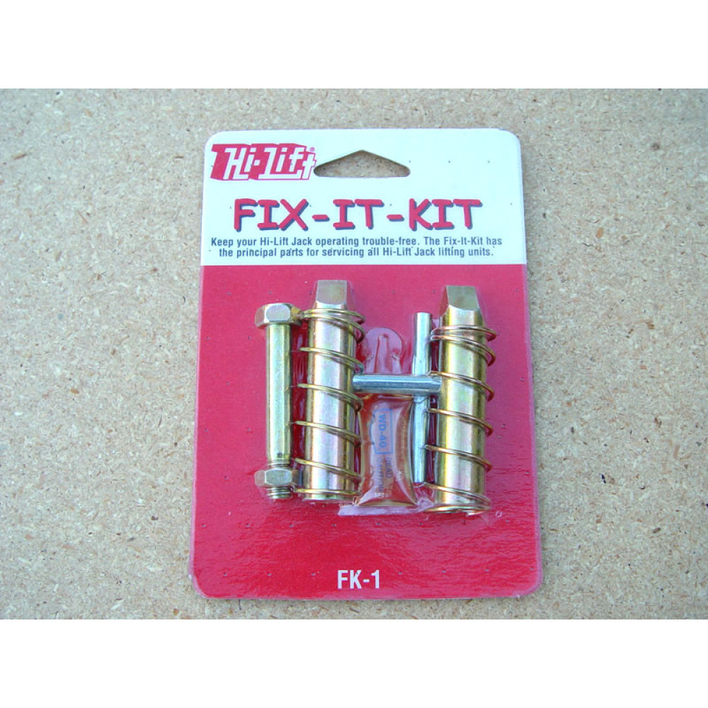 Ремкомплект реечного домкрата включает в себя наиболее подверженные износу детали механизма оригинального Hi-Lift. Предназначен для срочного ремонта и профилактического обслуживания всех моделей этой американской марки. В набор FK-1 входят пальцы-фиксаторы опорных площадок, их ограничители хода и пружины, а также болт-предохранитель, ограничивающий возможность развивать на клюве усилие более трёх тонн, и тем самым защищающий остальной механизм от перегрузки. При превышении нагрузки этот болт ломается, предотвращая возможность наращивать усилие дальше, но груз остаётся безопасно зафиксированном на своей высоте.