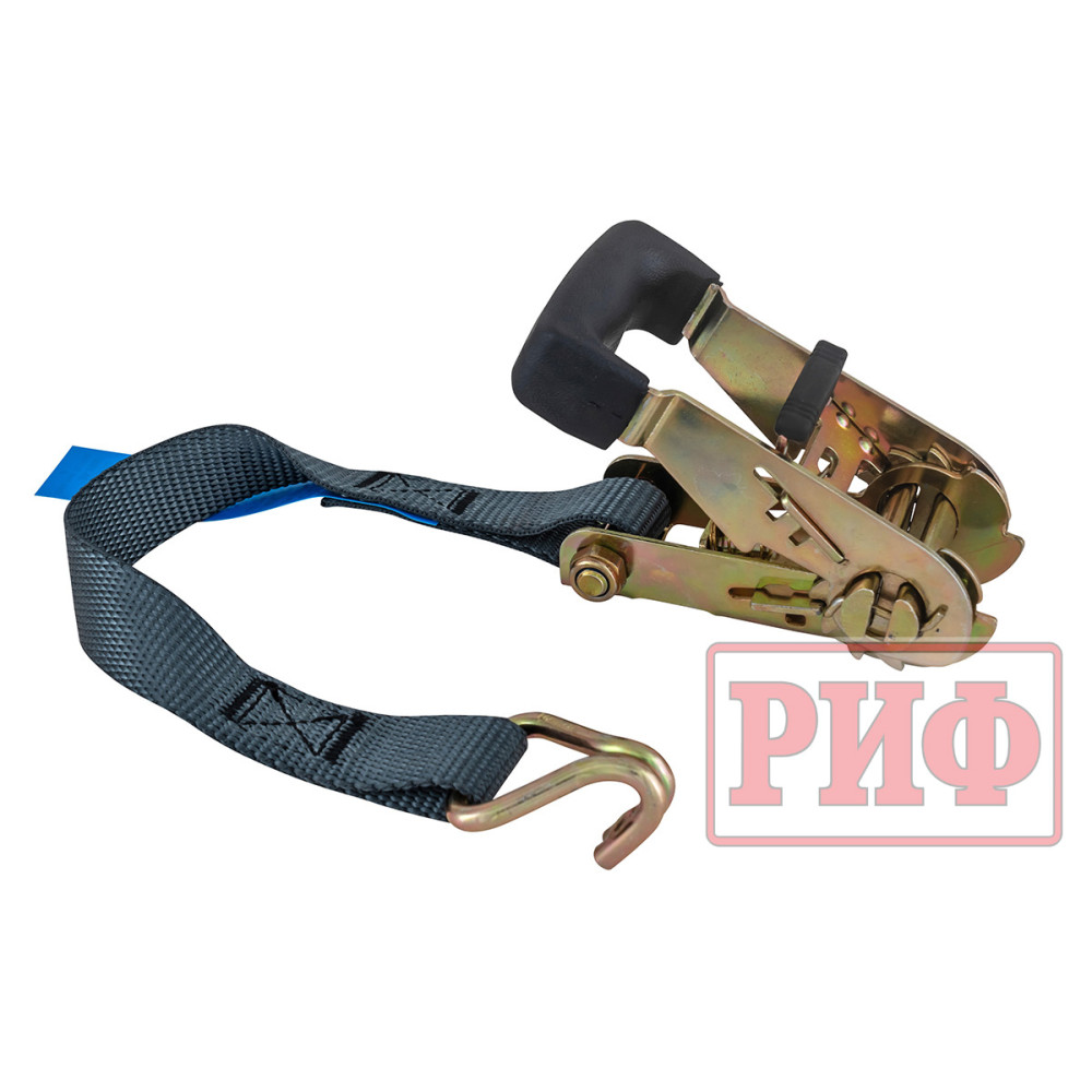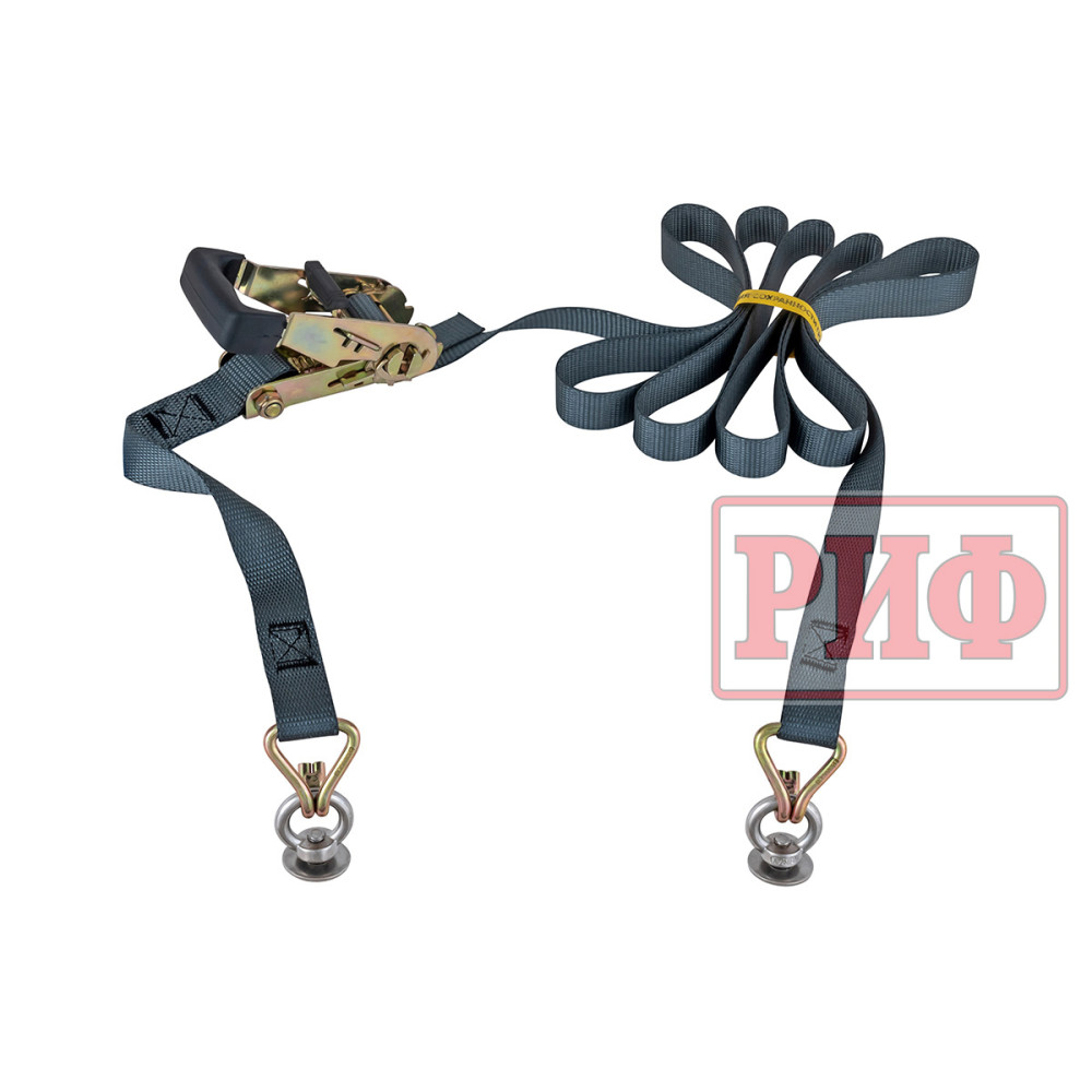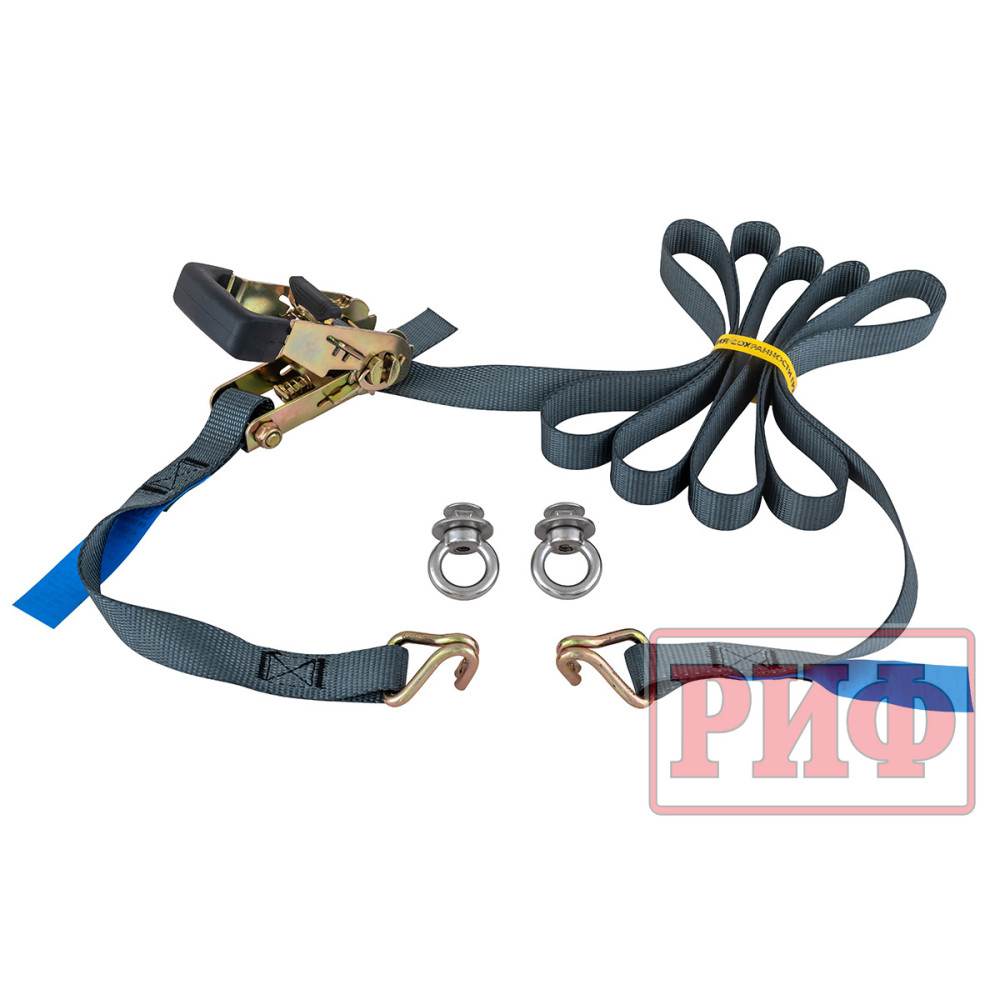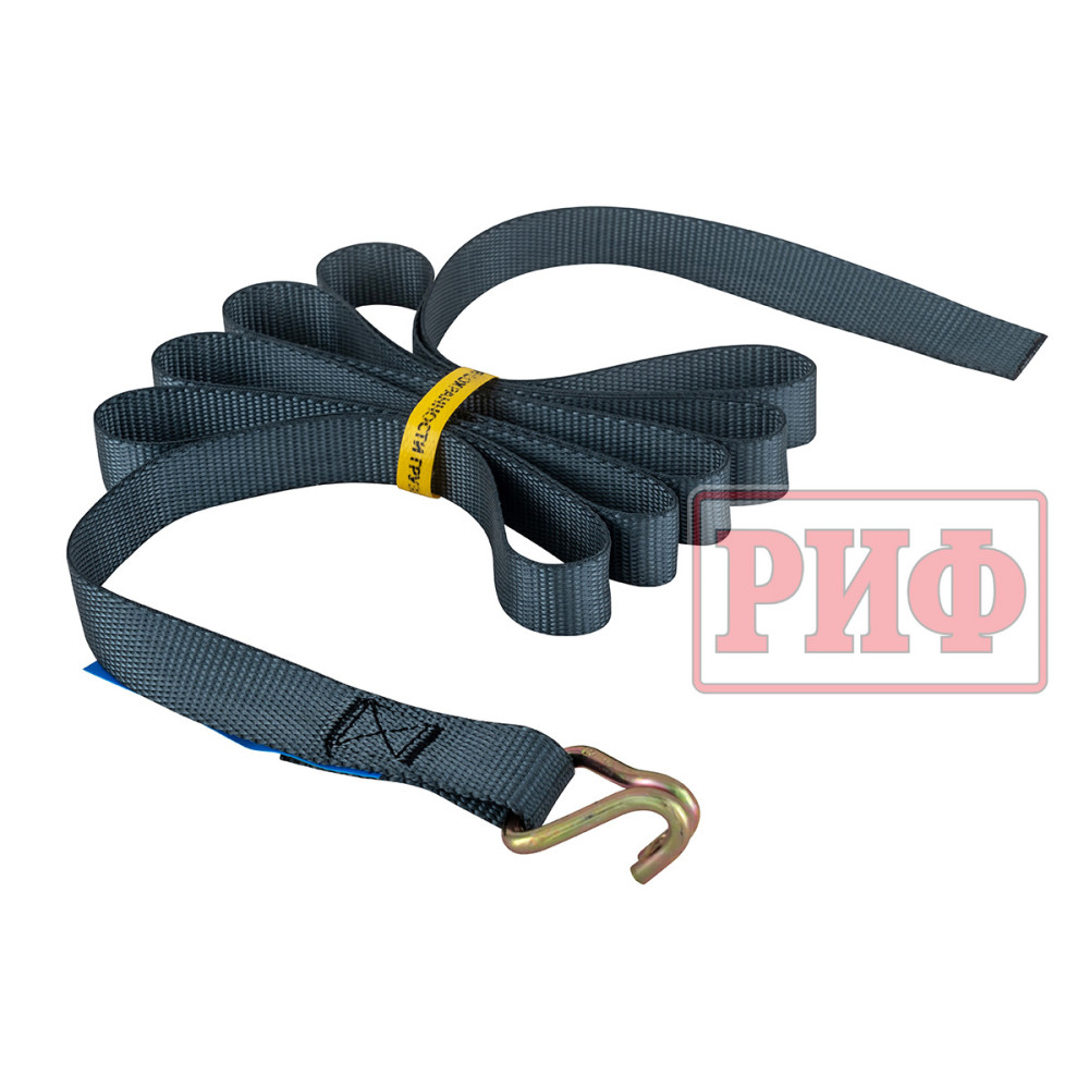 Ремень крепежный стяжной для багажной системы РИФ имеет длину 3000 мм, ширину 25 мм, прочность на разрыв 1500 кг.