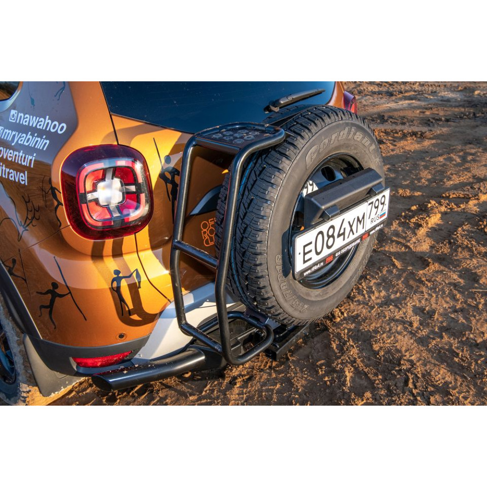 Отличительной особенностью новой лестницы является ее универсальность. Лестницу можно установить на колеса, практически, любого размера, начиная от штатного запасного колеса Renault Duster и заканчивая шинами диаметром 36-38 дюймов.