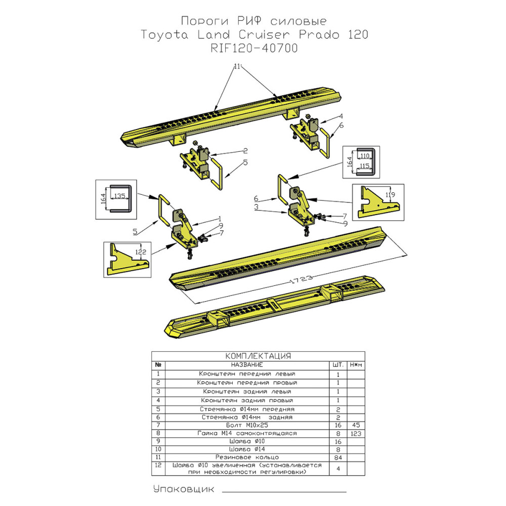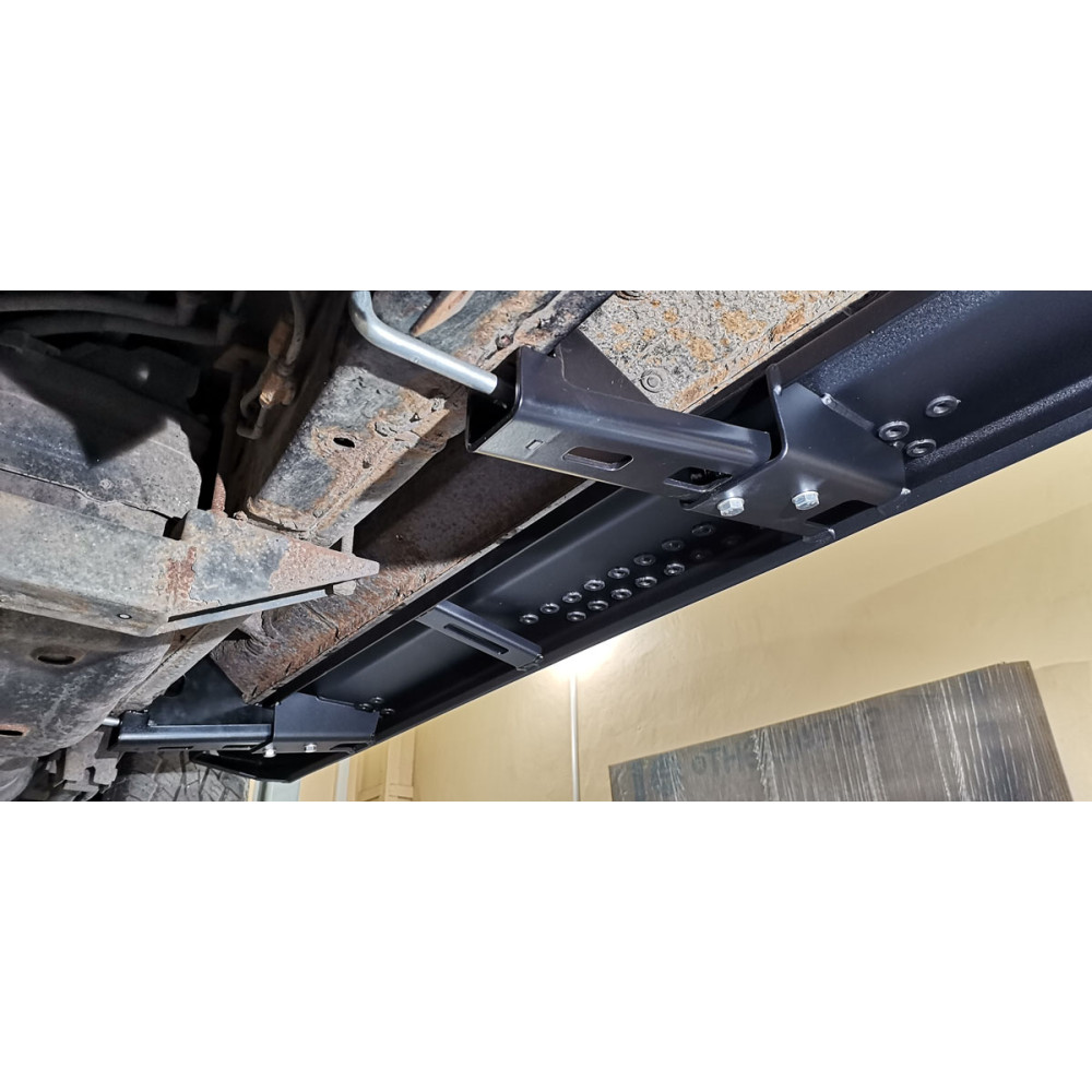 Силовые пороги РИФ предназначены для защиты кузова вашего автомобиля как в городе, так и на бездорожье – можно упереться в бревно или камень, можно опереться на край колеи – порог обеспечит надежную защиту. Пороги легко выдерживают подъем хай-джеком. Забраться в салон Land Cruiser Prado 120 благодаря порогам РИФ легко и просто. Конструкция порогов РИФ крайне прочна и долговечна, пороги рассчитаны на эксплуатацию в тяжелых условиях. Пороги крепятся к раме с помощью стремянок. Черное порошковое покрытие защищает от коррозии в любых условиях эксплуатации и не боится самых агрессивных реагентов. Весь силовой обвес РИФ рассчитан на эксплуатацию в тяжелых условиях, сертифицирован для использования в Российской Федерации; при установке никаких доработок автомобиля не требуется Цена указана за комплект из двух порогов. Вес: 50 кг Установка новых силовых порогов РИФ на Toyota Land Cruiser Prado 120: пошаговая инструкция и обзор