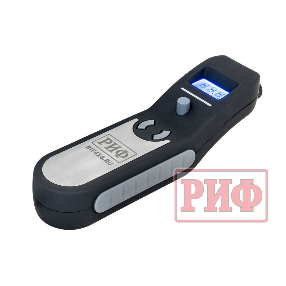5. Для стравливания шин плотно прижмите манометр к ниппелю шины (не должно быть слышно шипения воздуха). Нажмите и удерживайте кнопку сброса давления, пока значение на экране не достигнет желаемого. После этого отпустите кнопку и снимите манометр с шины.
