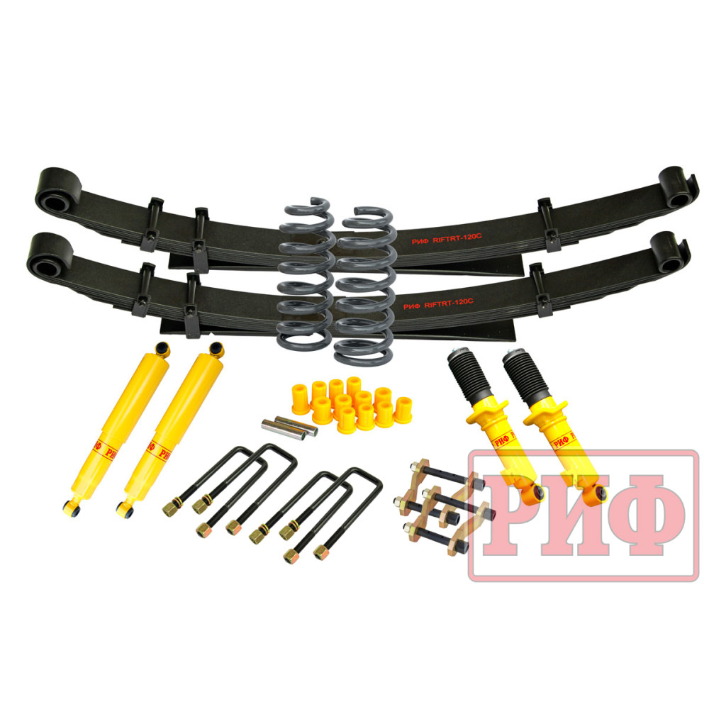 Все компоненты лифт-комплектов РИФ разработаны специально для эксплуатации внедорожника в тяжелых условиях на различных дорожных покрытиях. Рессоры, амортизаторы с технологией R-AIR и пружины РИФ не только компенсируют вес установленного на внедорожнике дополнительного оборудования (бамперов, порогов, дополнительных топливных баков, лебедок и прочего), но также существенно повышают грузоподъемность автомобиля. Удлиненные стремянки и серьги РИФ произведены из высококачественных материалов и имеют увеличенный запас прочности. Рессорные втулки РИФ изготовлены из полиуретана обладает высокой упругостью, износостойкостью и термоустойчивостью к высоким или низким температурам.