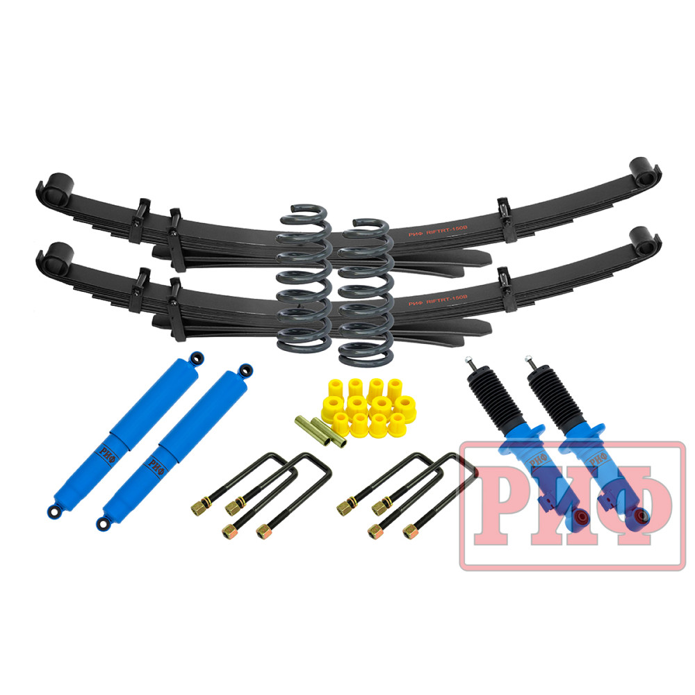 Все компоненты лифт-комплектов РИФ разработаны специально для эксплуатации внедорожника в тяжелых условиях на различных дорожных покрытиях. Рессоры, амортизаторы с технологией R-AIR и пружины РИФ не только компенсируют вес установленного на внедорожнике дополнительного оборудования (бамперов, порогов, дополнительных топливных баков, лебедок и прочего), но также существенно повышают грузоподъемность автомобиля. Удлиненные стремянки и серьги РИФ произведены из высококачественных материалов и имеют увеличенный запас прочности. Рессорные втулки РИФ изготовлены из полиуретана обладает высокой упругостью, износостойкостью и термоустойчивостью к высоким или низким температурам.