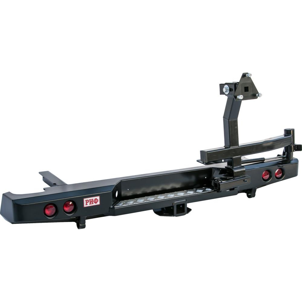 Задний силовой бампер РИФ надежно защитит кузов автомобиля на бездорожье или в городе в случае непредвиденных инцидентов. Бампер оборудован упорами под хай джек и буксирными проушинами для работы с рывковой или буксировочной стропой.