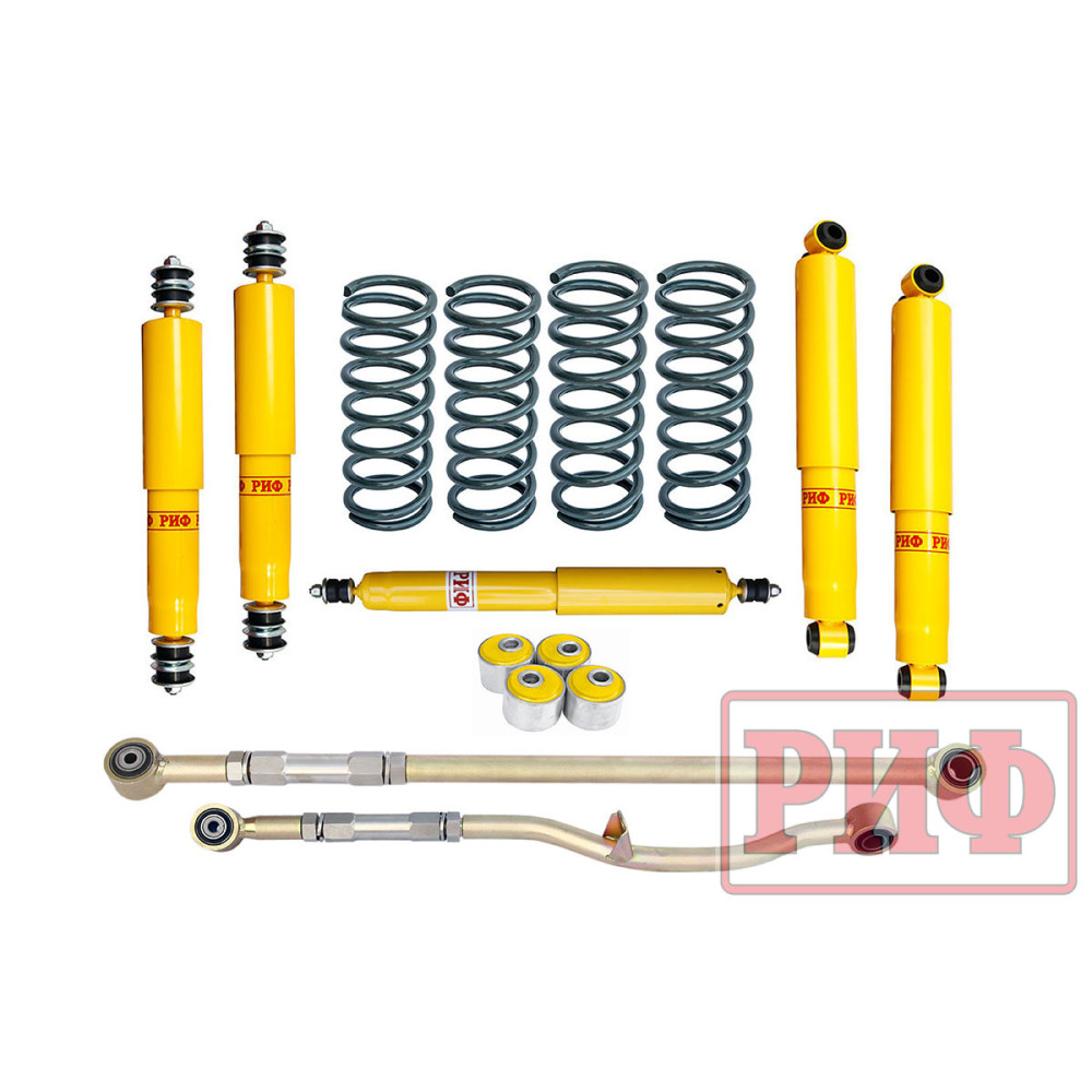 Все компоненты лифт-комплектов РИФ разработаны специально для эксплуатации внедорожника в тяжелых условиях на различных дорожных покрытиях. Рессоры, амортизаторы с технологией Foam Cell и пружины РИФ не только компенсируют вес установленного на внедорожнике дополнительного оборудования (бамперов, порогов, дополнительных топливных баков, лебедок и прочего), но также существенно повышают грузоподъемность автомобиля. Удлиненные стремянки и серьги РИФ произведены из высококачественных материалов и имеют увеличенный запас прочности. Рессорные втулки РИФ изготовлены из полиуретана обладает высокой упругостью, износостойкостью и термоустойчивостью к высоким или низким температурам.