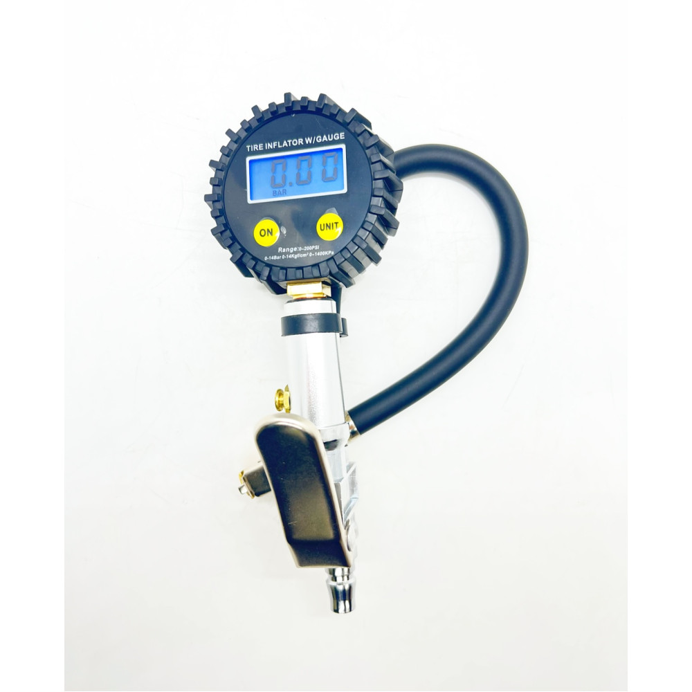 Пистолет для подкачки колёс с электронным манометром до 220PSI или 15bar с плоским курком и с кнопкой стравливания, ЕВРО разъем под шланг