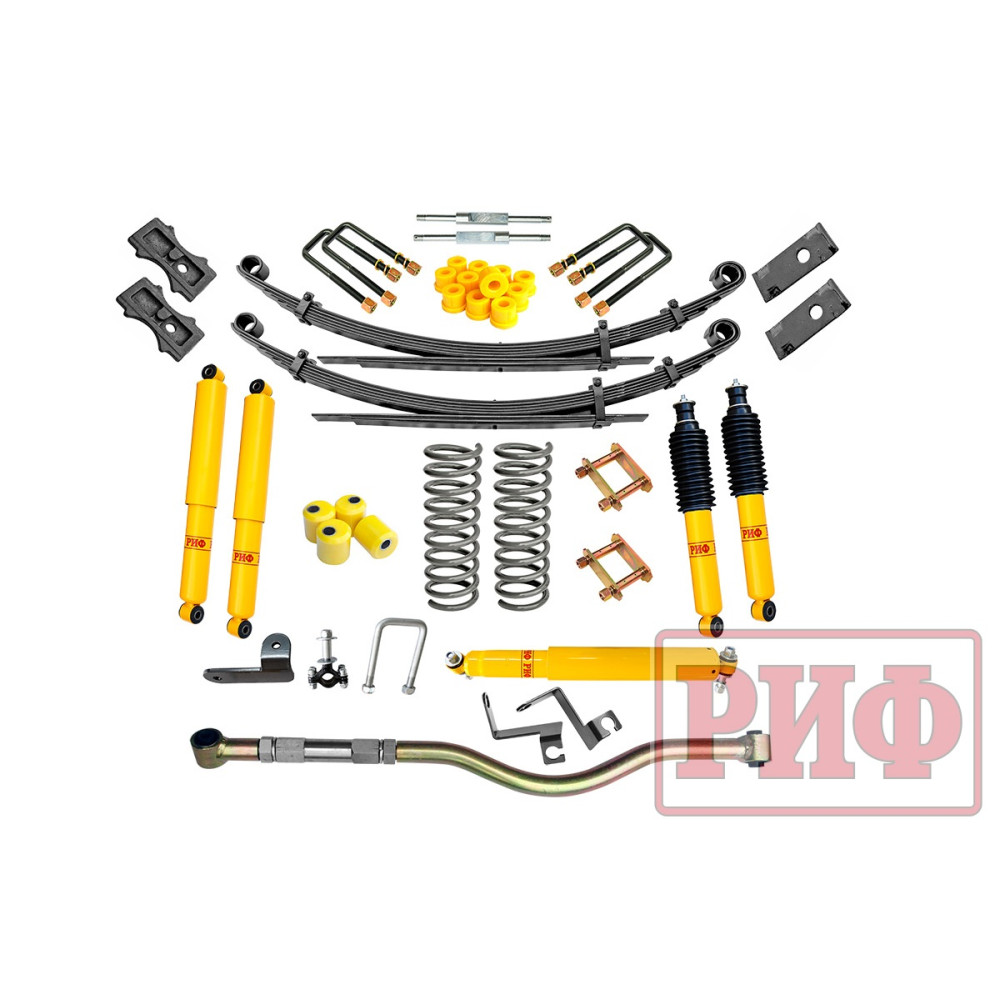 Все компоненты лифт-комплектов РИФ разработаны специально для эксплуатации внедорожника в тяжелых условиях на различных дорожных покрытиях. Рессоры, амортизаторы с технологией Foam Cell и пружины РИФ не только компенсируют вес установленного на внедорожнике дополнительного оборудования (бамперов, порогов, дополнительных топливных баков, лебедок и прочего), но также существенно повышают грузоподъемность автомобиля. Удлиненные стремянки и серьги РИФ произведены из высококачественных материалов и имеют увеличенный запас прочности. Рессорные втулки РИФ изготовлены из полиуретана обладает высокой упругостью, износостойкостью и термоустойчивостью к высоким или низким температурам.