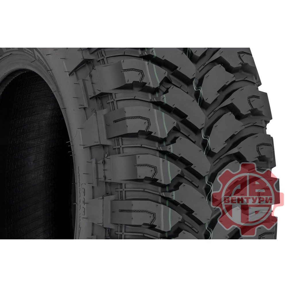 Направленная зубастая «елочка» эффективно самоочищается на бездорожье благодаря широким диагональным бороздкам и грязеотталкивающим выступам между шашками, а довольно агрессивный дизайн усиленных боковин с хорошими грунтозацепами обеспечивает уверенное движение по самому сложному рельефу, в том числе и на стравленных шинах, и высокую устойчивость к порезам и повреждениям.