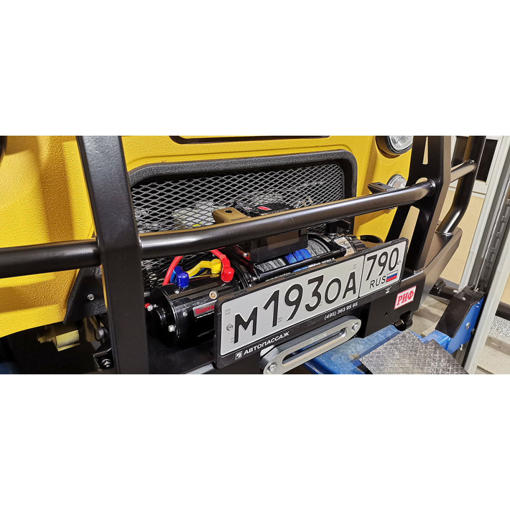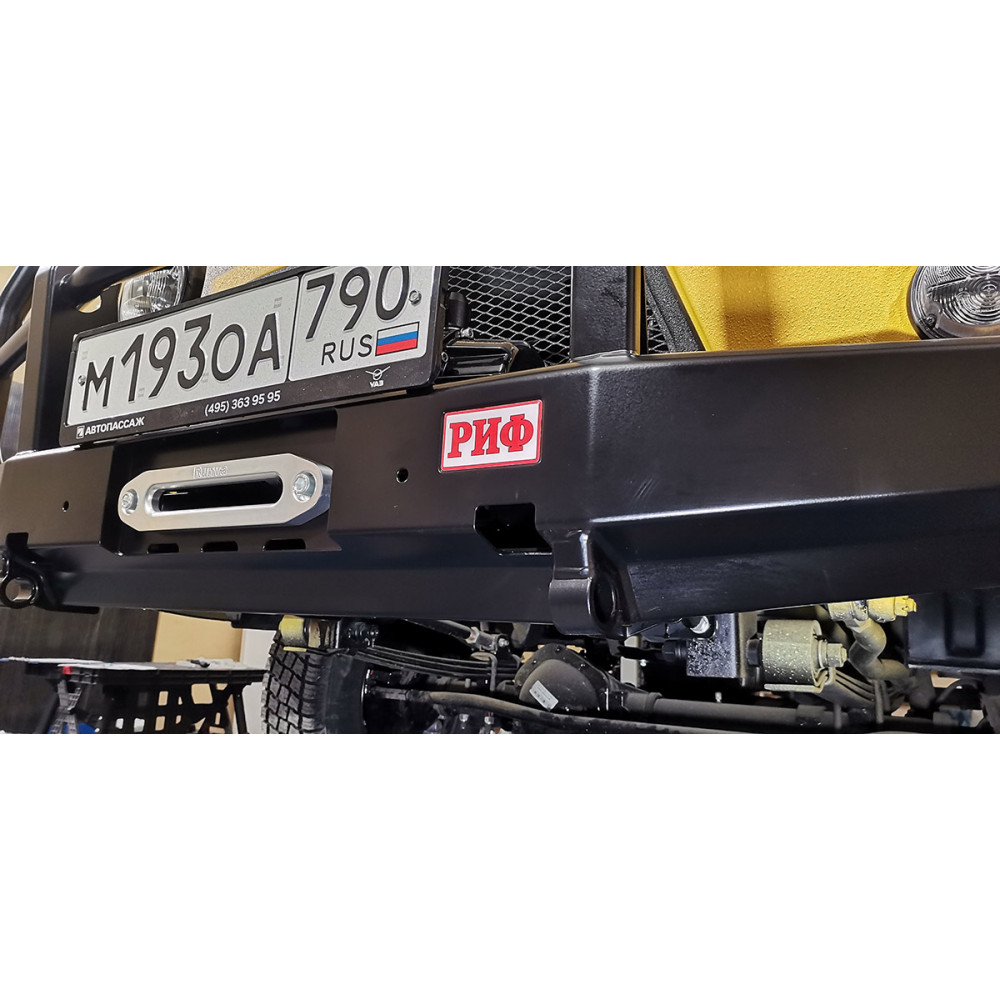 Бампер не оснащен интегрированной площадкой для лебедки, ее нужно докупать отдельно - площадка РИФ устанавливается в раму. В бампере имеется отверстие под трос лебедки. Бампер «РИФ» оборудован мощными упорами под реечный домкрат и буксирными проушинами для работы с рывковым тросом или буксировочной стропой.