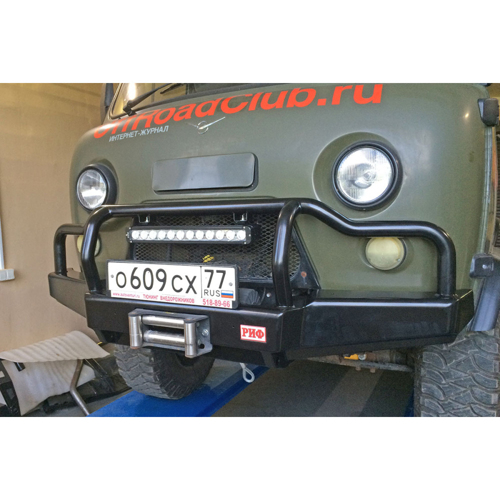 Бампер РИФ силовой передний УАЗ Буханка усиленный, c площ. под лебёдку, с низкой защитной дугой, лифт 65 мм
