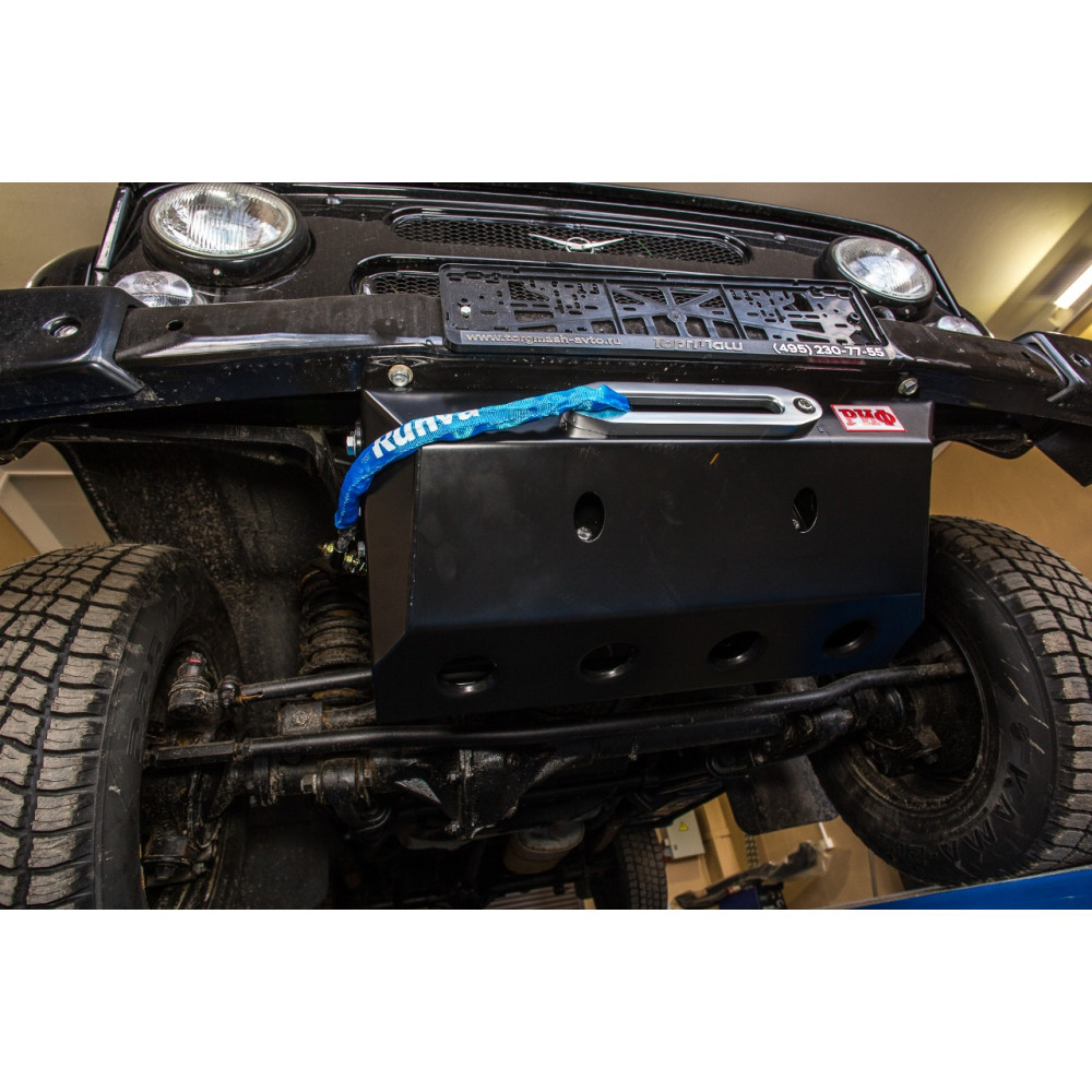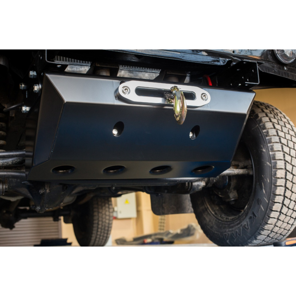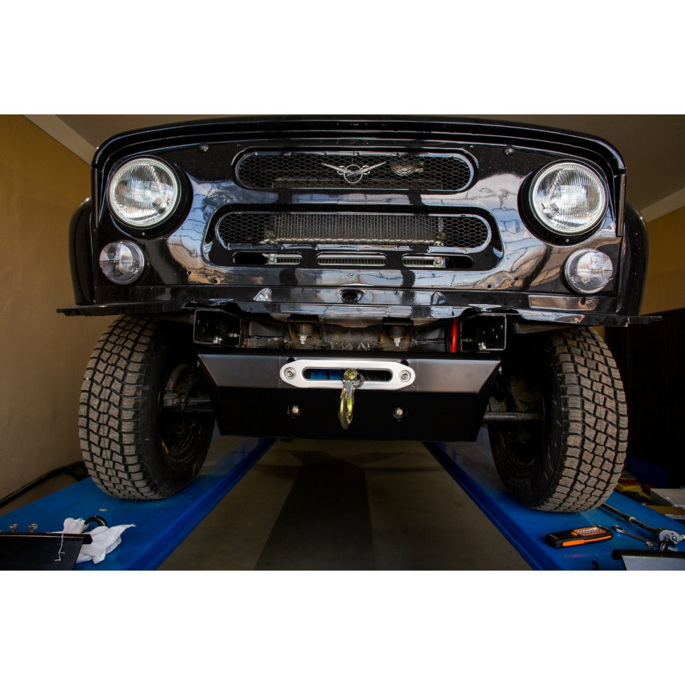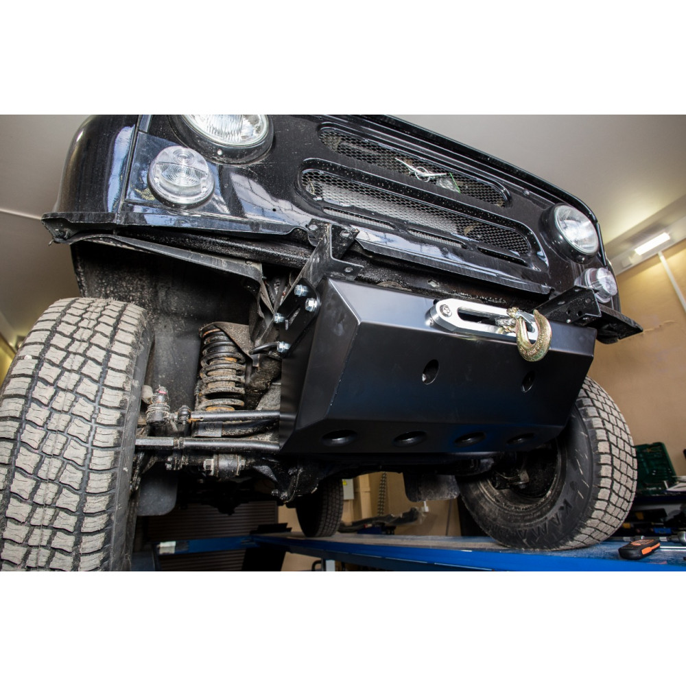 Универсальная конструкция, объединяющая в себе защиту рулевых тяг и площадку для скрытой установки электрической лебёдки, предназначена для установки на автомобиль УАЗ Хантер со штатным передним бампером. Данное изделие не привлекает излишнего внимания к себе и легко устанавливается. Прекрасно подойдёт для тех автовладельцев, которые не планируют серьезных конструктивных доработок с автомобилем, а просто хотят добавить уверенности в преодолении бездорожья.