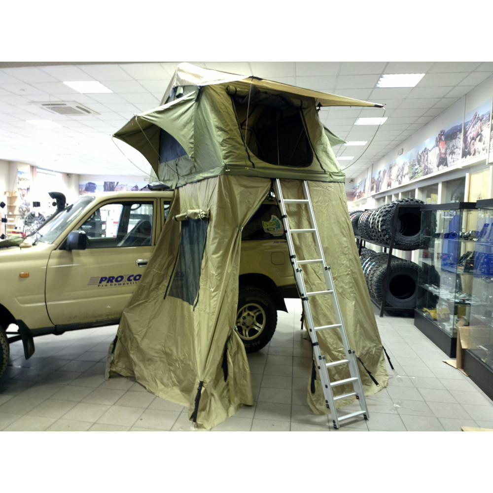 Палатка туристическая быстрораскладывающаяся СТОКРАТ для установки на крышу автомобиля с дополнительным тамбуром.