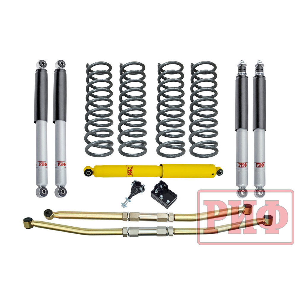 Все компоненты лифт-комплектов РИФ разработаны специально для эксплуатации внедорожника в тяжелых условиях на различных дорожных покрытиях. Амортизаторы с технологией R-Air и пружины РИФ не только компенсируют вес установленного на внедорожнике дополнительного оборудования (бамперов, порогов, дополнительных топливных баков, лебедок и прочего), но также существенно повышают грузоподъемность автомобиля.