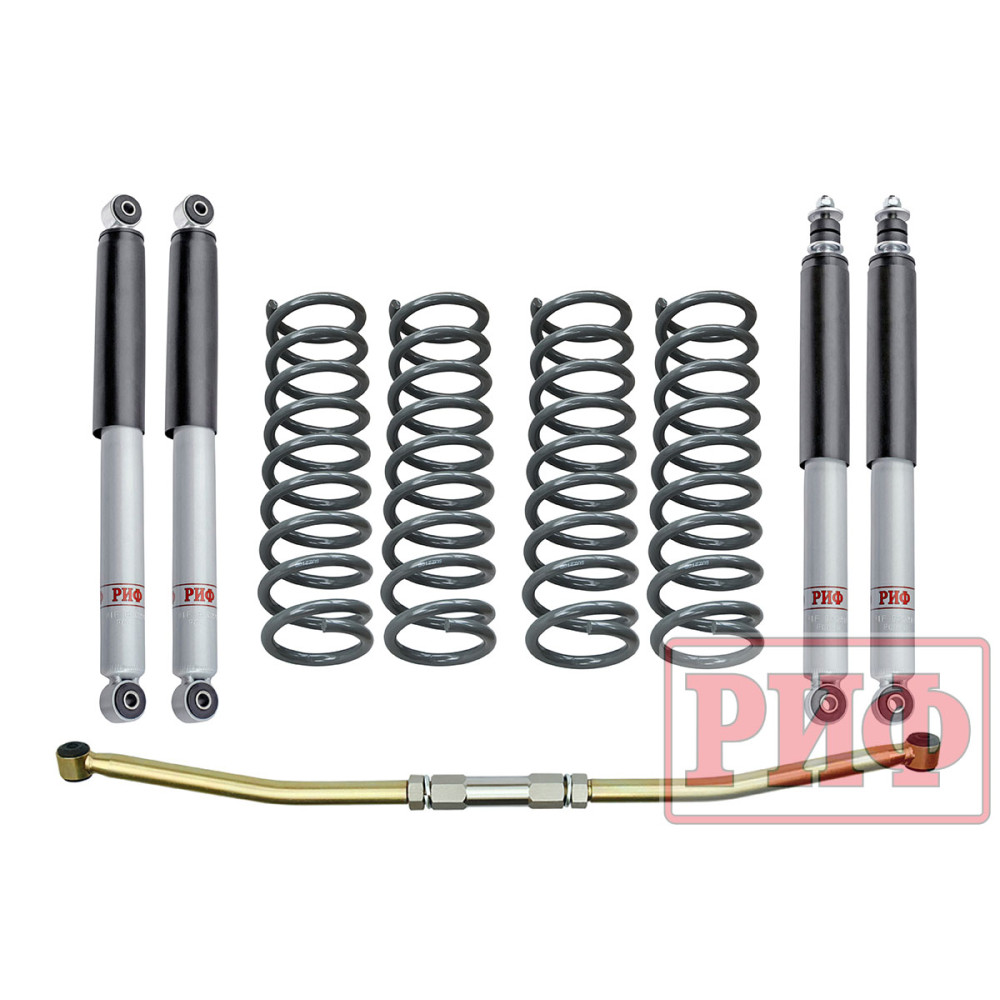 Все компоненты лифт-комплектов РИФ разработаны специально для эксплуатации внедорожника в тяжелых условиях на различных дорожных покрытиях. Амортизаторы с технологией R-Air и пружины РИФ не только компенсируют вес установленного на внедорожнике дополнительного оборудования (бамперов, порогов, дополнительных топливных баков, лебедок и прочего), но также существенно повышают грузоподъемность автомобиля.