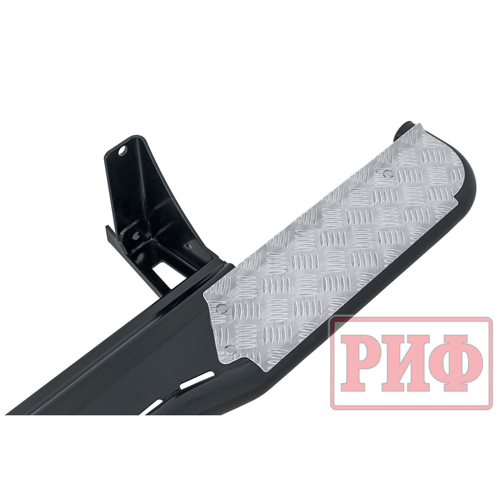 Видимая часть силовых порогов РИФ для Toyota Hilux выполнена из стальной трубы (толщина стенки 2,5 мм, диаметр — 51 мм), сверху — накладка из рифленого алюминия. Пороги не портят внешний вид автомобиля, органично вписываясь в экстерьер, благодаря продуманному дизайну.