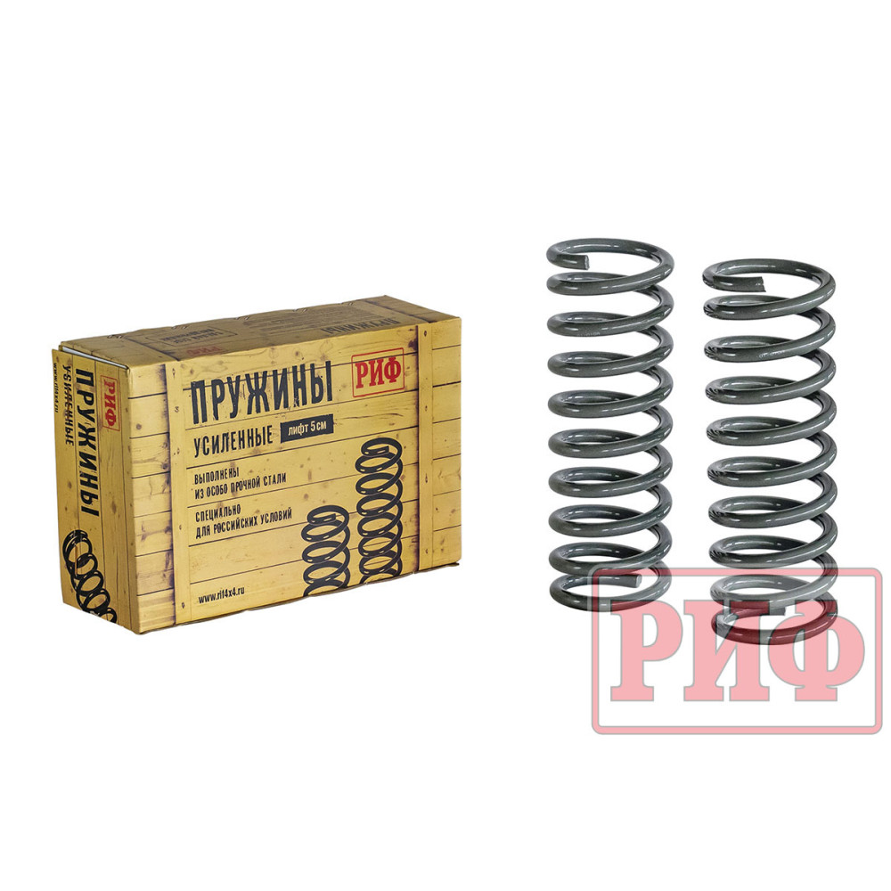 Пружины РИФ изготовлены из высококачественной стали и предназначены специально для подготовки внедорожника к тяжелым условиям эксплуатации. Они позволяют «отлифтовать» внедорожник и увеличить его грузоподъемность, компенсировав при этом вес установленного дополнительного оборудования – силовых бамперов, багажника, лебедки.