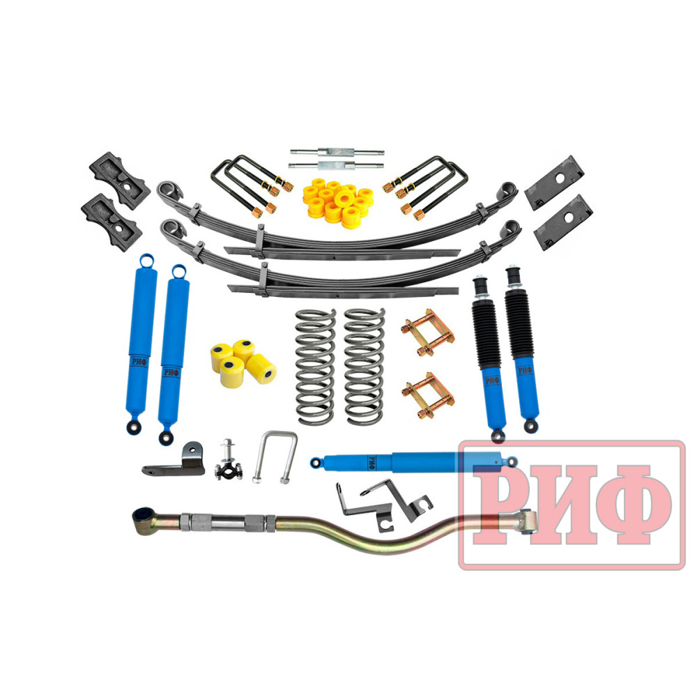 Все компоненты лифт-комплектов РИФ разработаны специально для эксплуатации внедорожника в тяжелых условиях на различных дорожных покрытиях. Амортизаторы с технологией R-AIR и пружины РИФ не только компенсируют вес установленного на внедорожнике дополнительного оборудования (бамперов, порогов, дополнительных топливных баков, лебедок и прочего), но также существенно повышают грузоподъемность автомобиля.