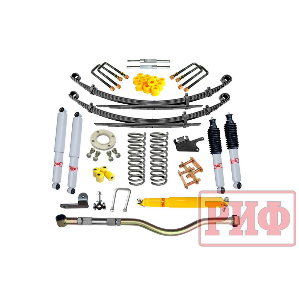 Все компоненты лифт-комплектов РИФ разработаны специально для эксплуатации внедорожника в тяжелых условиях на различных дорожных покрытиях. Рессоры, амортизаторы с технологией R-AIR и пружины РИФ не только компенсируют вес установленного на внедорожнике дополнительного оборудования (бамперов, порогов, дополнительных топливных баков, лебедок и прочего), но также существенно повышают грузоподъемность автомобиля. Удлиненные стремянки и серьги РИФ произведены из высококачественных материалов и имеют увеличенный запас прочности. Рессорные втулки РИФ изготовлены из полиуретана обладает высокой упругостью, износостойкостью и термоустойчивостью к высоким или низким температурам.