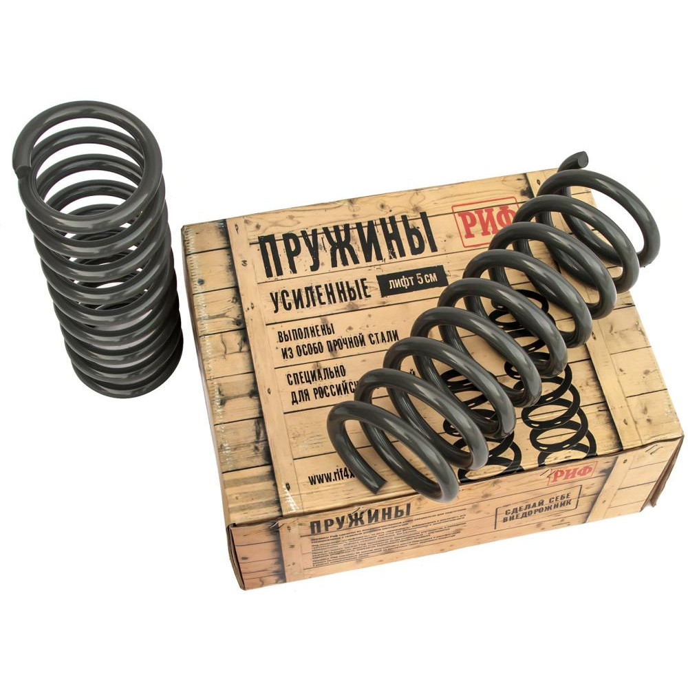 Пружины РИФ изготовлены из высококачественной стали и предназначены специально для подготовки внедорожника к тяжелым условиям эксплуатации. Они позволяют «отлифтовать» внедорожник и увеличить его грузоподъемность, компенсировав при этом вес установленного дополнительного оборудования – силовых бамперов, багажника, лебедки.