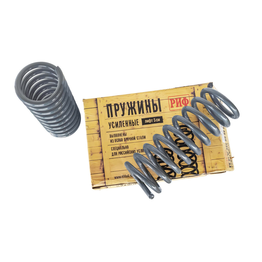 Пружины РИФ изготовлены из высококачественной стали и предназначены специально для подготовки внедорожника к тяжелым условиям эксплуатации. Они позволяют «отлифтовать» внедорожник и увеличить его грузоподъемность, компенсировав при этом вес установленного дополнительного оборудования – силовых бамперов, багажника, лебедки.