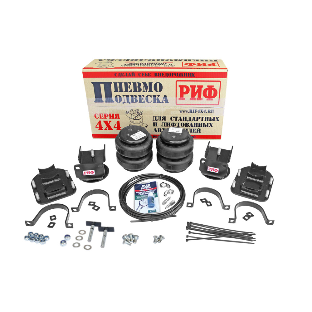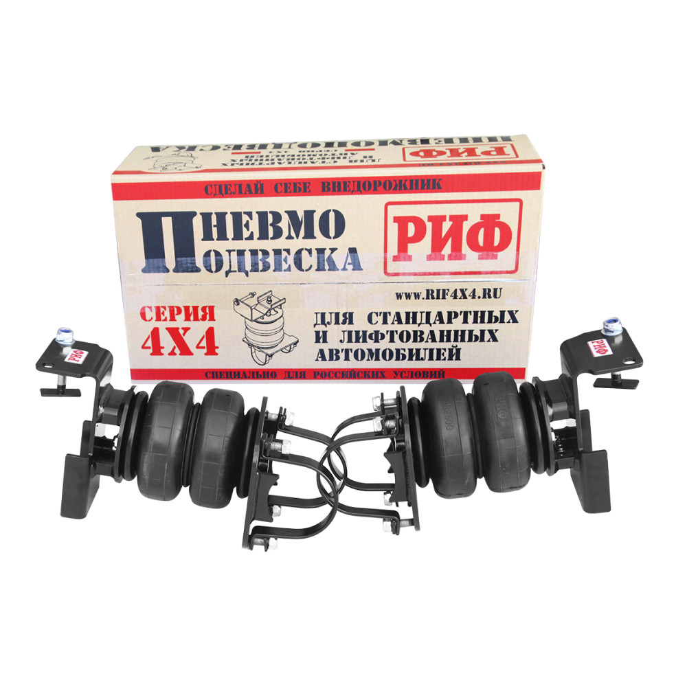 Комплект пневмоподвески РИФ устанавливается в дополнение к штатной подвеске автомобиля и позволяет снизить нагрузку на рессоры и использовать полную грузоподъёмность автомобиля без изменения геометрической проходимости.