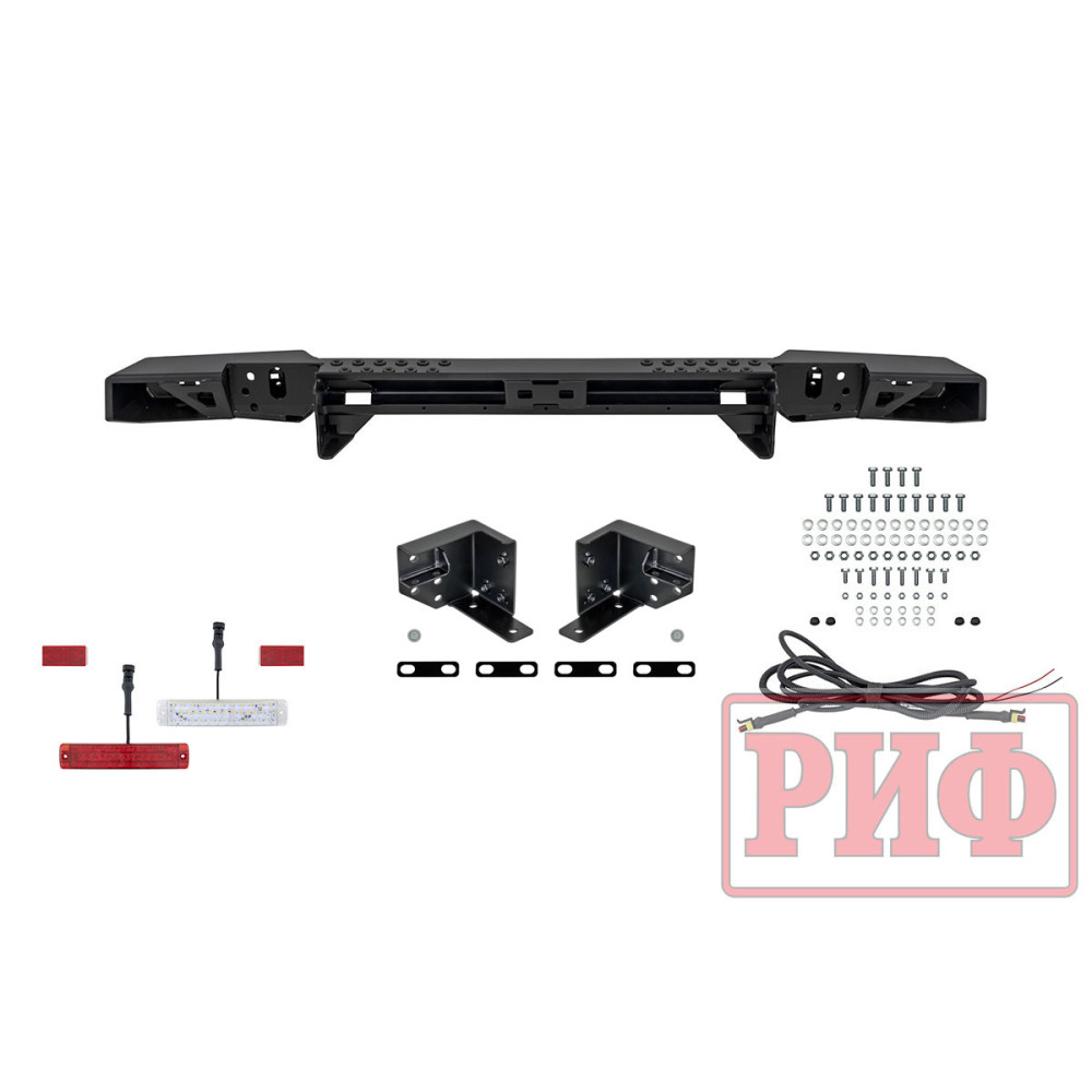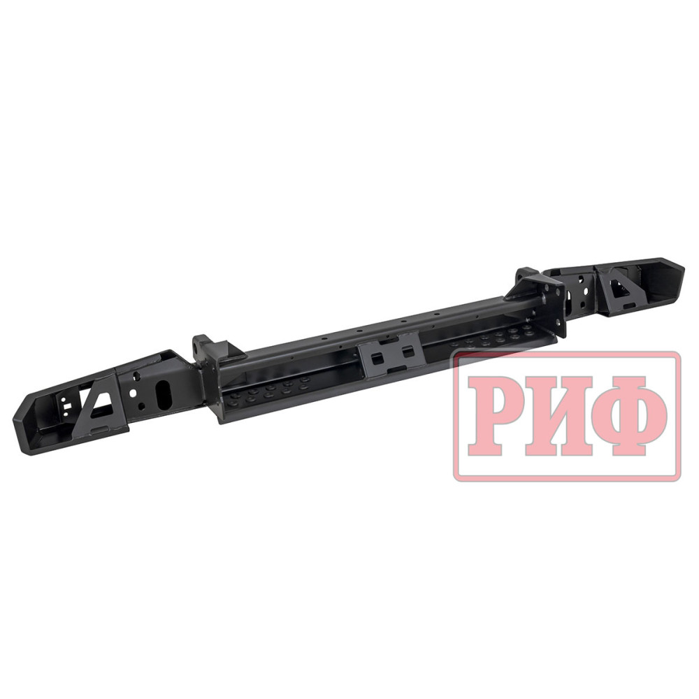 Задний силовой бампер РИФ надежно защитит кузов автомобиля на бездорожье или в городе в случае непредвиденных инцидентов. Бампер оборудован упорами под хай джек и буксирными проушинами для работы с рывковой или буксировочной стропой.