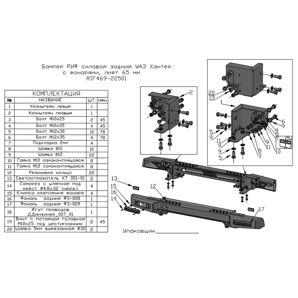 • Бампер РИФ силовой задний УАЗ Хантер с фонарями, возможностью установки фаркопа, лифт 65 мм