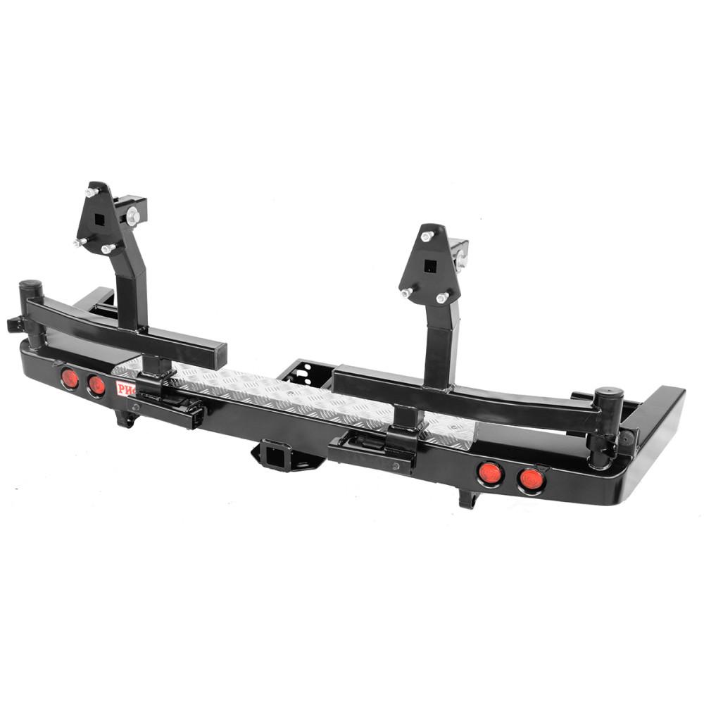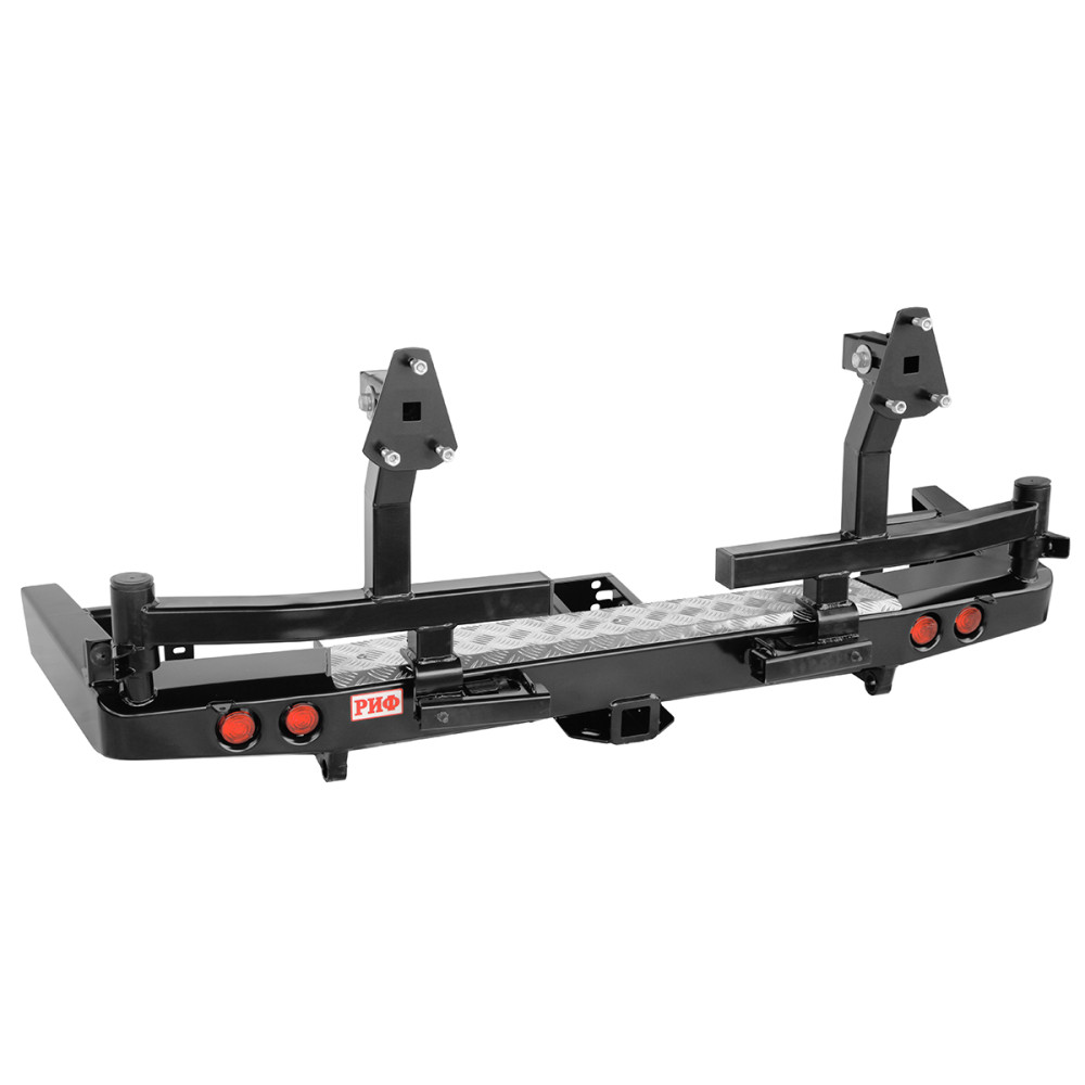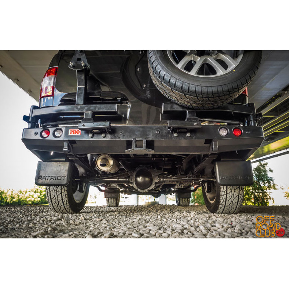 Бампер РИФ силовой задний УАЗ Патриот 2015+ с квадратом под фаркоп, фонарями, 2-мя калитками, подсветкой номера, стандарт