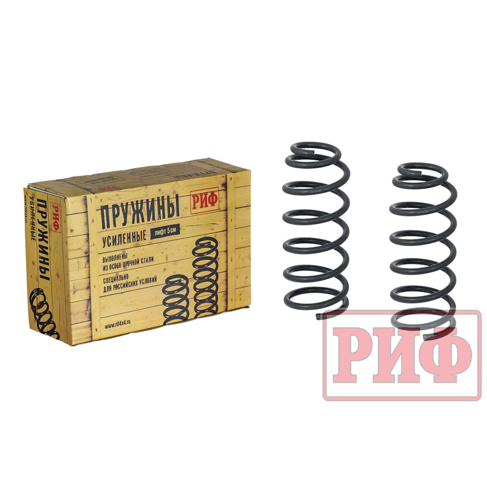Пружины РИФ изготовлены из высококачественной конструкционной стали и предназначены специально для подготовки внедорожника к тяжелым условиям эксплуатации. Они позволяют «отлифтовать» внедорожник и увеличить его грузоподъемность, компенсировав при этом вес установленного дополнительного оборудования – силовых бамперов, багажника, лебедки.