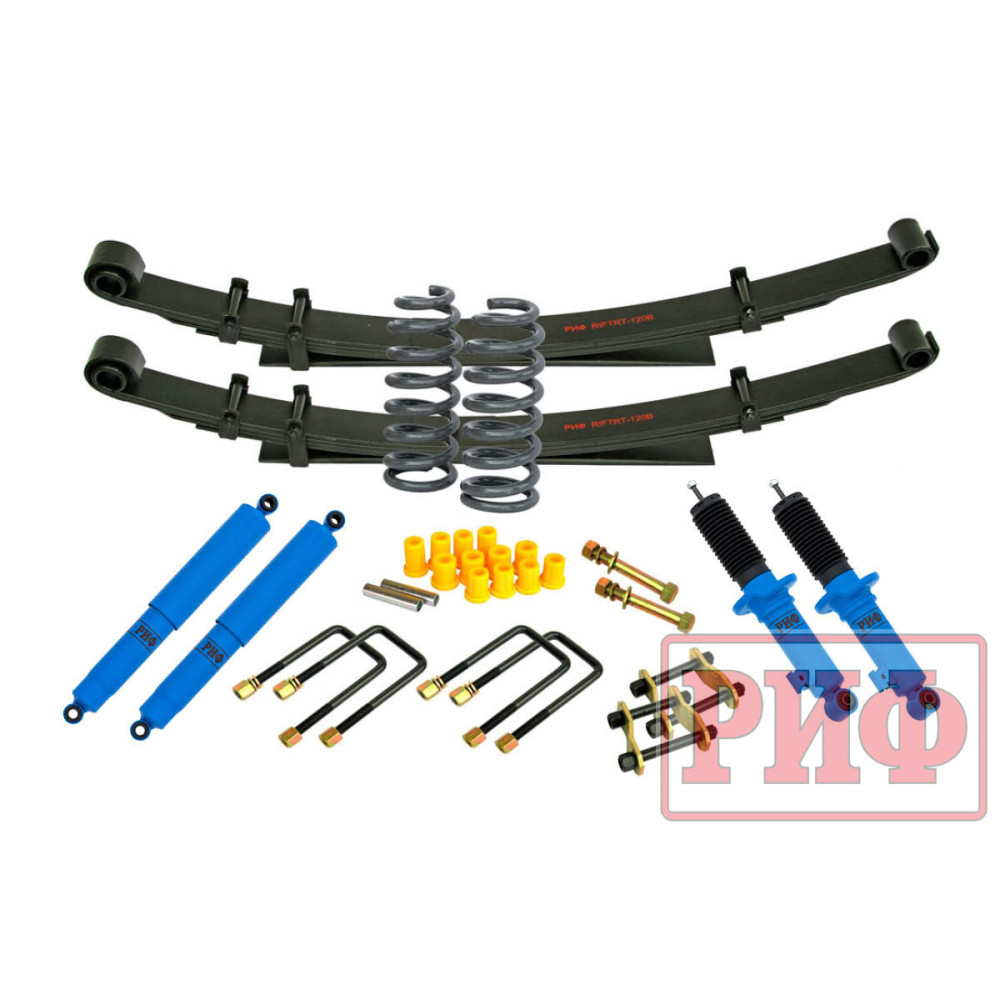 Все компоненты лифт-комплектов РИФ разработаны специально для эксплуатации внедорожника в тяжелых условиях на различных дорожных покрытиях. Амортизаторы с технологией R-AIR и пружины РИФ не только компенсируют вес установленного на внедорожнике дополнительного оборудования (бамперов, порогов, дополнительных топливных баков, лебедок и прочего), но также существенно повышают грузоподъемность автомобиля.